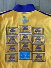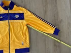 Adidas Los Angeles Lakers 16X Champs Banners Ring Ceremony Jacket 2010. Show your love for the Los Angeles Lakers and the late Kobe Bryant with this Adidas champion banners ring ceremony jacket. The gold jacket features the team's iconic purple and gold colors, with Bryant's number 24 and his nickname "Black Mamba" on the back. The jacket is made for men and is size XL, perfect for any fan of the NBA and the Lakers. This jacket is perfect for any occasion, whether you're going to the NBA Finals or just want to show your support for the Lakers. The jacket is made in Indonesia and is an official Adidas product. Get this jacket and show your love for the Lakers and Kobe Bryant today!
