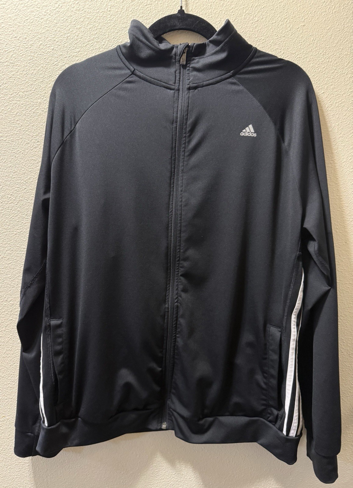 The Adidas Men's Black Climalite Long Sleeve Full-Zip Track Jacket in size XL is a classic activewear piece perfect for running and jogging in the winter season. Made from 100% polyester with a mid-length design, this track jacket features a solid black color with long sleeves and a zip closure for easy wear. The jacket also includes pockets for added convenience and is part of the adidas Climalite product line, known for its quality and performance in outdoor activities. With a regular fit and classic style, this track jacket is a reliable choice for active men looking for both style and functionality.