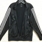 Adidas Jacket Mens Large Black White Track Full Zip 3 Stripe Climalite Athletic Condition: Good - gently worn, minor signs of use, no major visible flaws 100% polyester shell, Climalite fabric for moisture management Classic Adidas three white stripes down sleeves Small embroidered Adidas logo chest, Climalite logo back hem Full zip front with stand up collar and Adidas branded zipper pull Two side hand pockets Tag size: Large (Mens) Made in Cambodia Approximate flat measurements: pit to pit 23 in, back length 28 in Perfect for athletic activities, running, or casual streetwear style