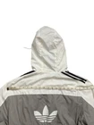 Missing size tags and care tags. Possibly a size Large. This Adidas Jacket for men in size Large features a stylish white colorblock design with black stripes, making it perfect for both casual and business occasions. Made of polyester with a polyester lining, this windbreaker is lightweight and wind-resistant, making it ideal for outdoor activities. The jacket includes a hood, full zip closure, and pockets for convenience. This modern and versatile piece from Adidas Originals also includes the iconic logo accents, adding a touch of sporty style to your wardrobe.