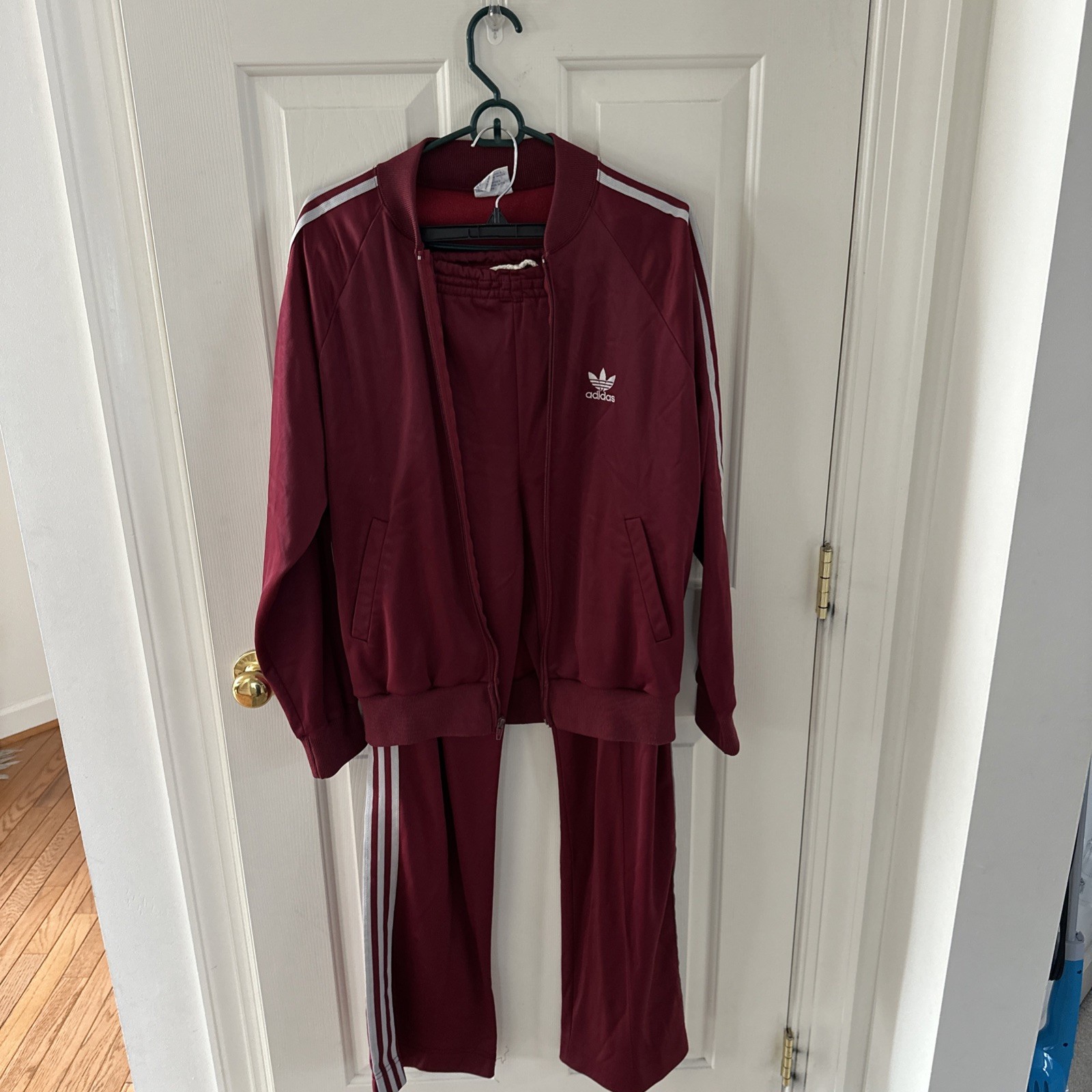The Adidas Men's Track Suit from the 1980s is a vintage two-piece activewear set in a burgundy color. Made of 50% polyester and 50% Arnel Triacetate, this track suit features a closed neckline, long sleeves, and a zip closure for easy wear. The regular fit and logo accents give it a classic look, perfect for summer, fall, or spring seasons. Machine washable for easy garment care, this retro track suit is a stylish addition to any man's wardrobe.