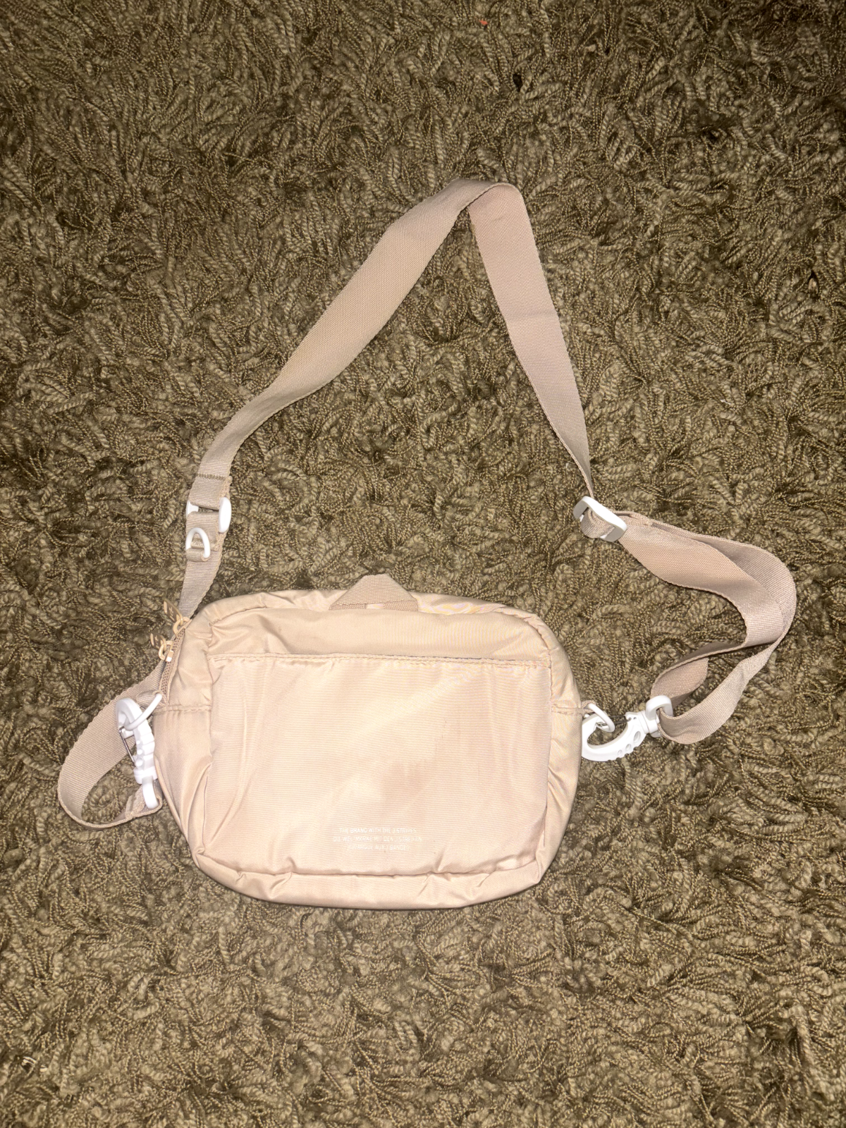 The Adidas Originals Trefoil Logo Puffer Crossbody Bag in Beige is a stylish and practical accessory designed for women. Its solid rectangle shape features a zip and buckle closure with a beige crossbody strap for easy wear. The exterior is made of durable nylon material in a neutral beige color adorned with the iconic Adidas Originals logo, making it suitable for travel, casual outings, or workwear. This bag also includes adjustable straps and features a subtle gray lining for added sophistication.