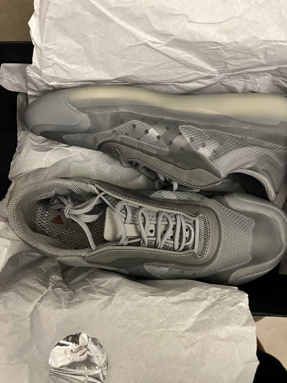Crafted for the modern man, the Adidas PRADA Luna Rossa 21 sneakers melds sophistication with sporty flair. These gunmetal grey sneakers are a testament to PRADA's commitment to quality, featuring an upper made from durable nylon that promises to withstand the rigors of daily wear while maintaining its sleek appearance. In a size 8.5, these shoes are designed to provide comfort and style without compromising on the iconic PRADA aesthetic. With a casual yet refined silhouette, they are versatile enough to complement a range of outfits, making them a essential addition to any discerning wardrobe.