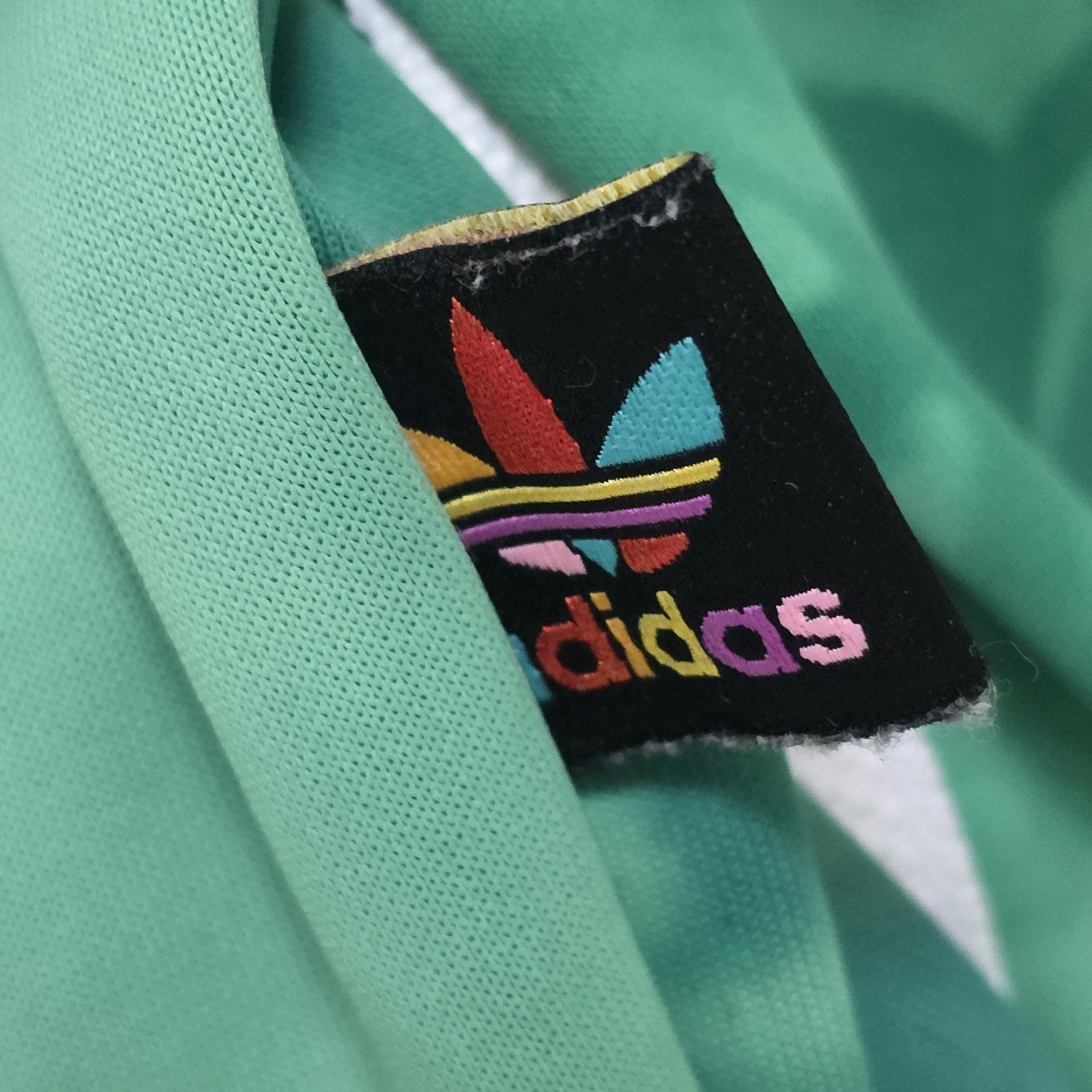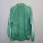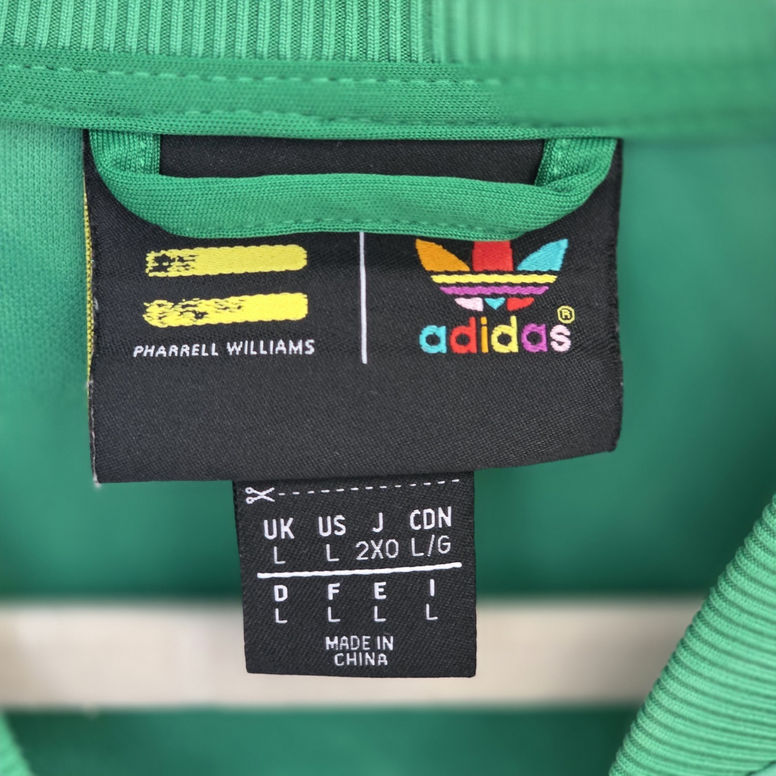The Adidas Pharrell Williams Human Race HU HOLIi Superstar Track Jacket in size L is a stylish and versatile outerwear piece perfect for travel, activewear, or casual outings. Made of breathable polyester/spandex material, this jacket features a full-zip closure, stand-up collar, and long sleeves. The green color and tie-dye pattern add a unique touch to the design, while the graphic and allover print showcase the collaboration with Pharrell Williams. With a regular fit and comfortable lining, this track jacket embodies the themes of lifestyle, athleisure, and sports for a fashionable and functional addition to any wardrobe.