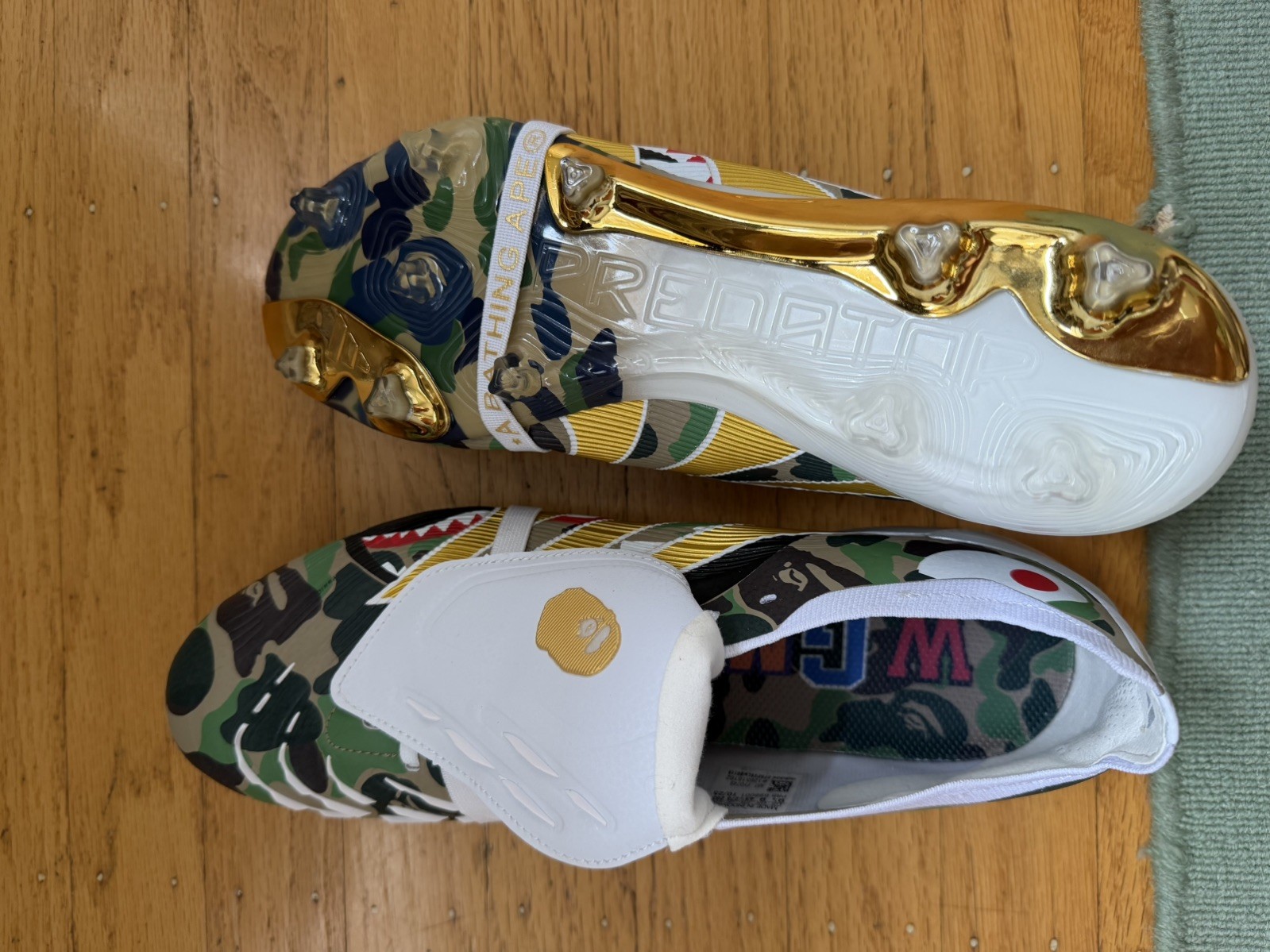 The Adidas Predator Elite FG x Bape Green in US size 10 is a sought-after combination of Adidas and Bape styles, offering a unique and trendy look for soccer players. These cleats in green color are designed for the sport of soccer, with a medium width for a comfortable fit. Made in Indonesia, these cleats are a must-have for any fan of both Adidas and Bape looking to make a statement on the field. Plus, with free shipping included, it's a great value for anyone looking to elevate their soccer game.