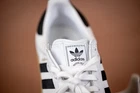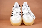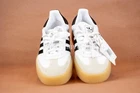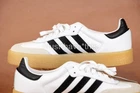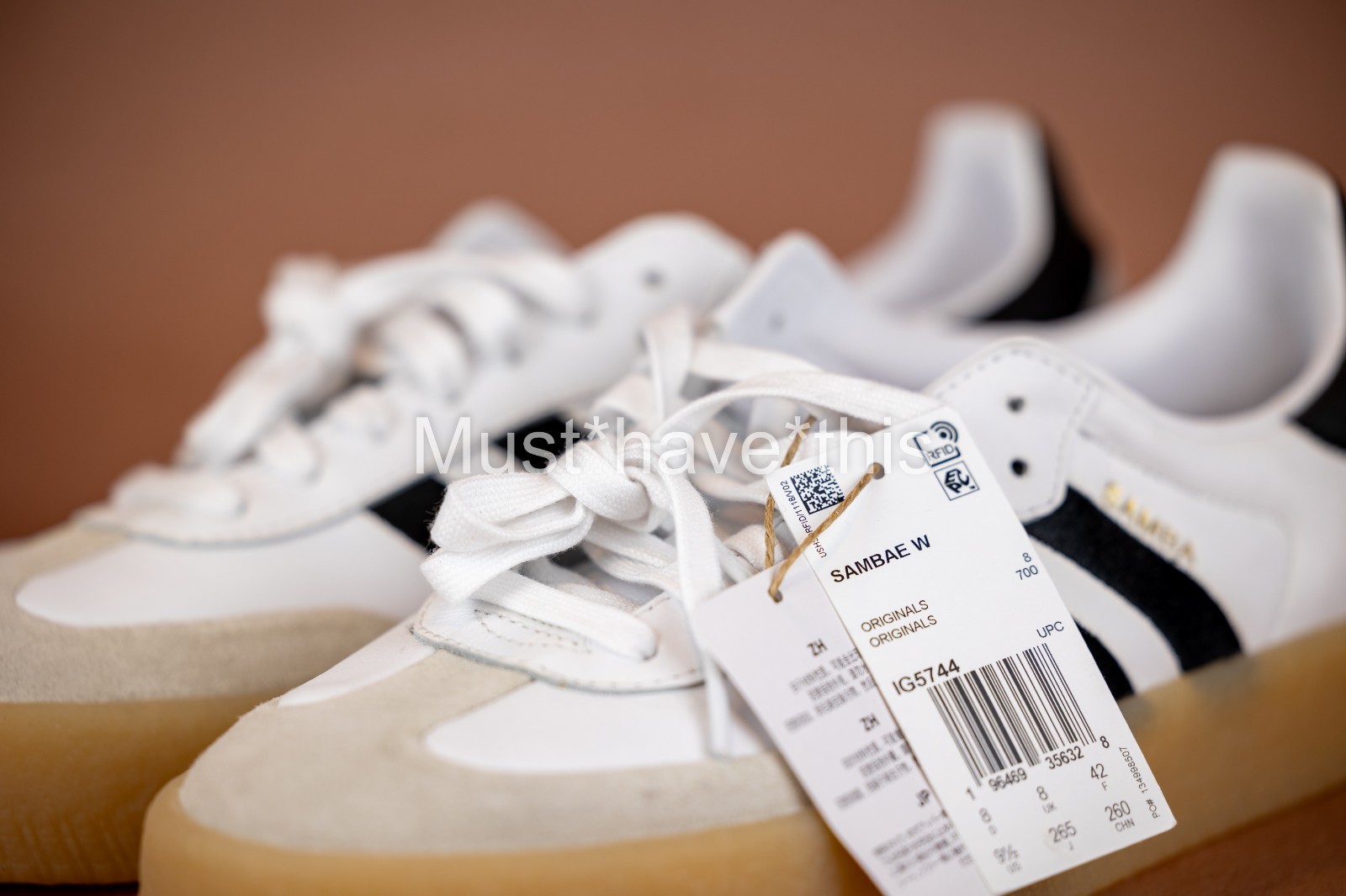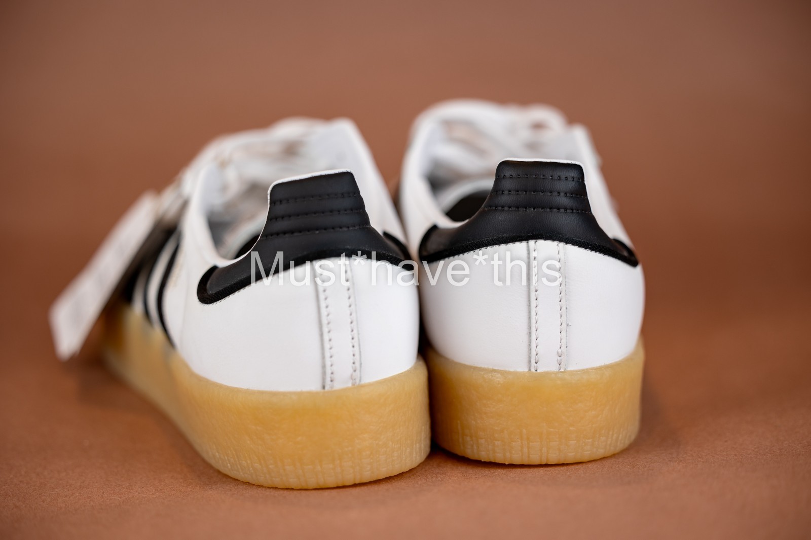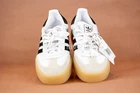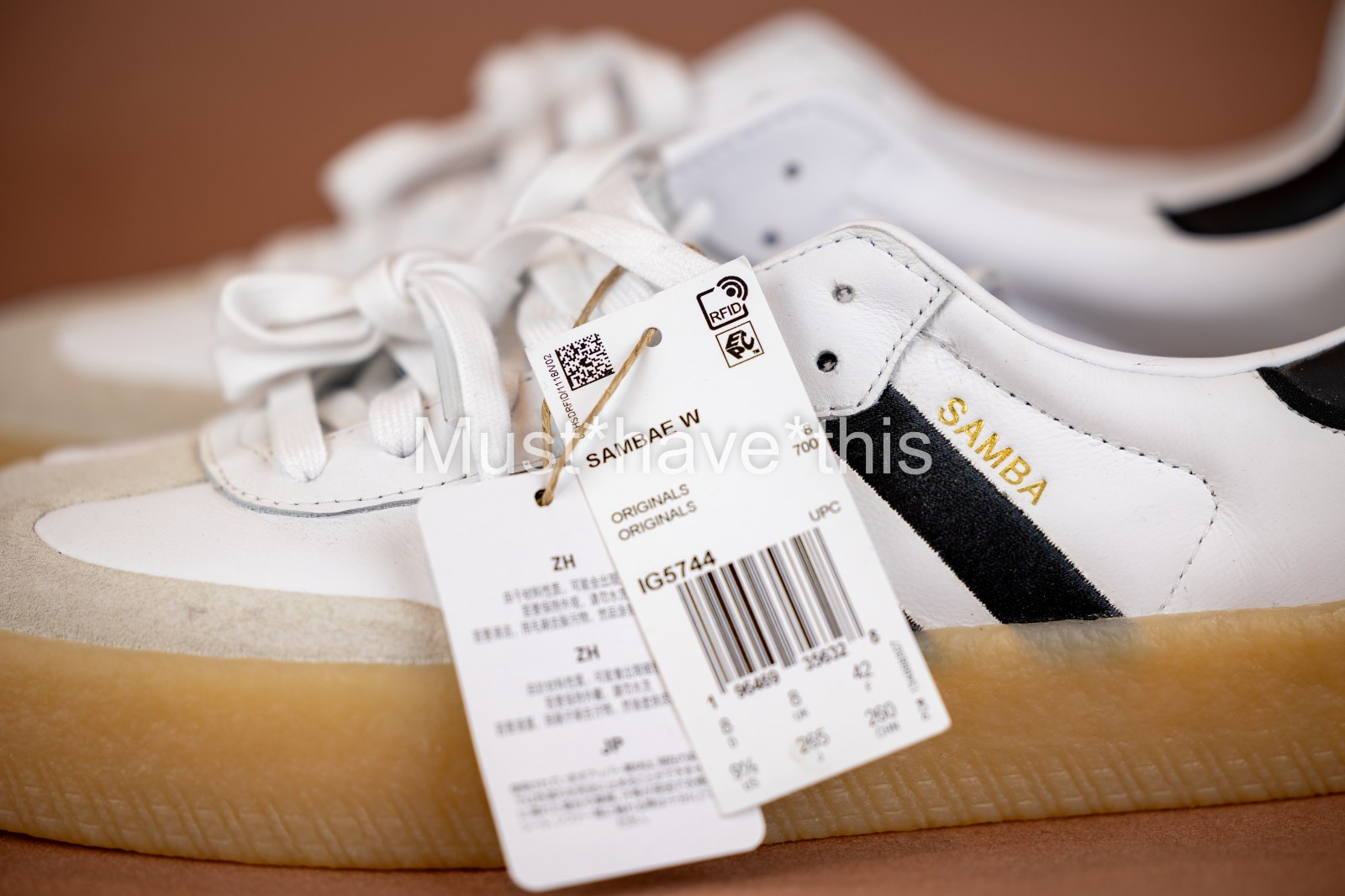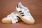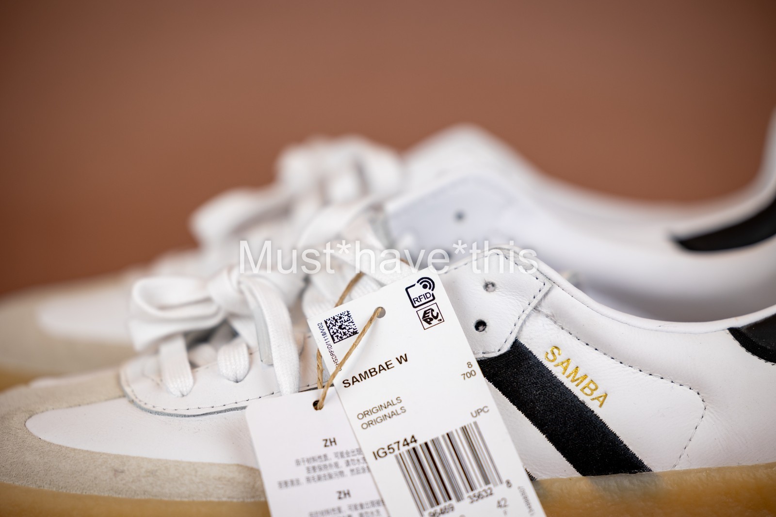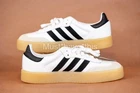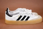 The product is a pair of Adidas Samba Sambae Women's Size 9.5 OG Leather Shoes in White Black Gum colorway. These sneakers feature a low top shoe shaft style, lace-up closure, and standard shoe width. Made with leather upper material, they offer arch support and comfort for various activities such as walking, skateboarding, and running & jogging. With a vintage-inspired theme, these athletic shoes are part of the Adidas Samba OG product line, perfect for women looking for a stylish and functional footwear option.