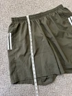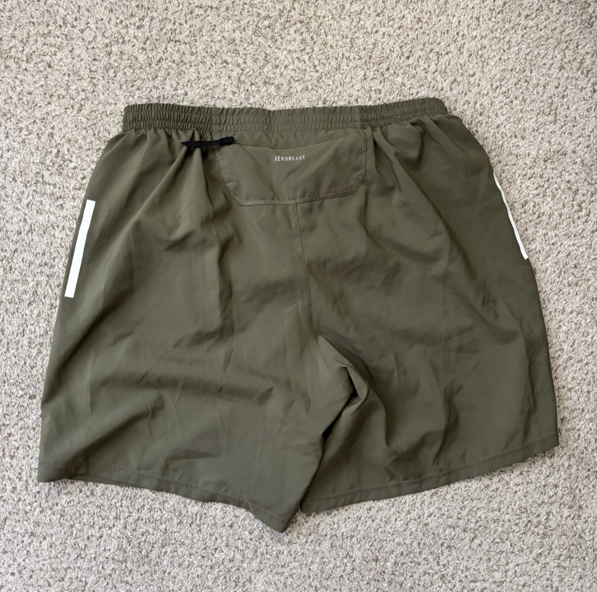 The Adidas Men's XL Olive Own The Run Shorts are lined, reflective, and feature a drawstring closure for a secure fit during gym, training, or running activities. Made of a blend of polyester and spandex, these athletic shorts are designed for comfort with moisture-wicking technology and an elastic waist. The solid green color and reflective back pouch add a stylish and practical touch for outdoor or sports-themed occasions, making them a versatile and high-quality choice for active men in the summer and spring seasons.