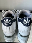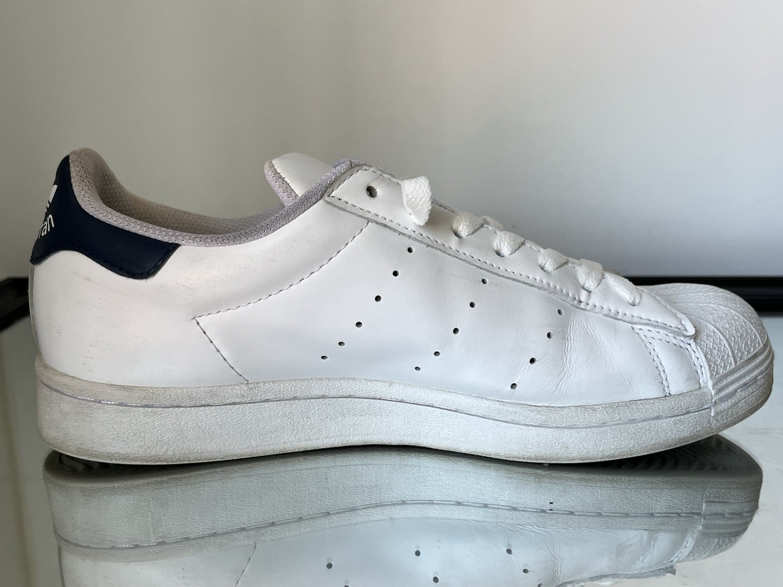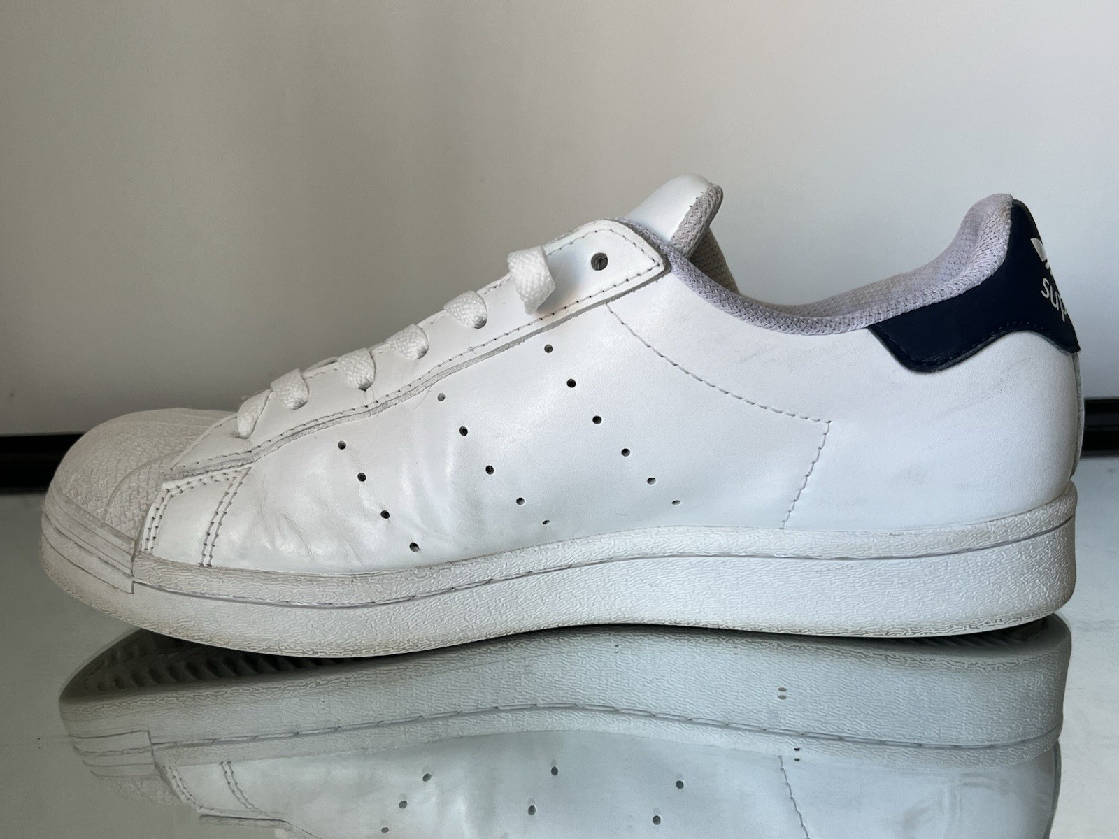 New laces, cleaned uppers. The Adidas Superstan Stan Smith Superstar in size 8.5 features a classic white and navy color scheme, perfect for athletic activities. This sneaker from the Adidas Superstan product line combines style and comfort with its iconic design. With its sleek silhouette and iconic Adidas branding, this shoe is a modern take on a timeless classic, making it a standout choice for men or women looking for a versatile and fashionable footwear option. New ones can cost around $100