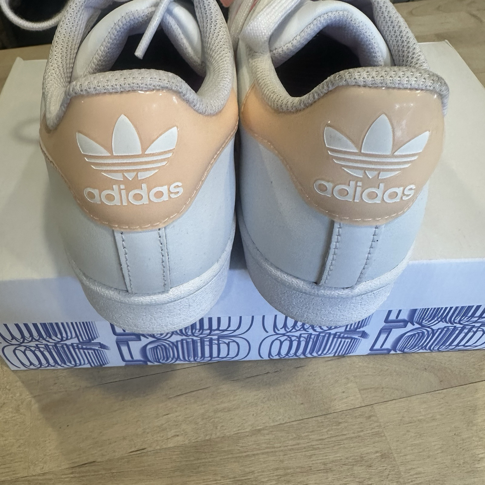Addidas Superstar Womens Shoes Originals Leather Sneakers White Pink Size 8.5 is a pair of shoes that offers arch support, comfort, adjustable strap, adjustable, cap toe, and breathable features. The outsole material is leather and the lining material is also leather. These shoes are perfect for walking, cross training, and CrossFit. The closure is lace-up and the shoe width is M. The Adidas Superstar is a classic sneaker that comes in a solid pattern with a peach character. The shoes are from the Adidas Superstar product line and are customized. The shoes are available in UK shoe size 7, EU shoe size 40 2/3, and US shoe size 8.5.