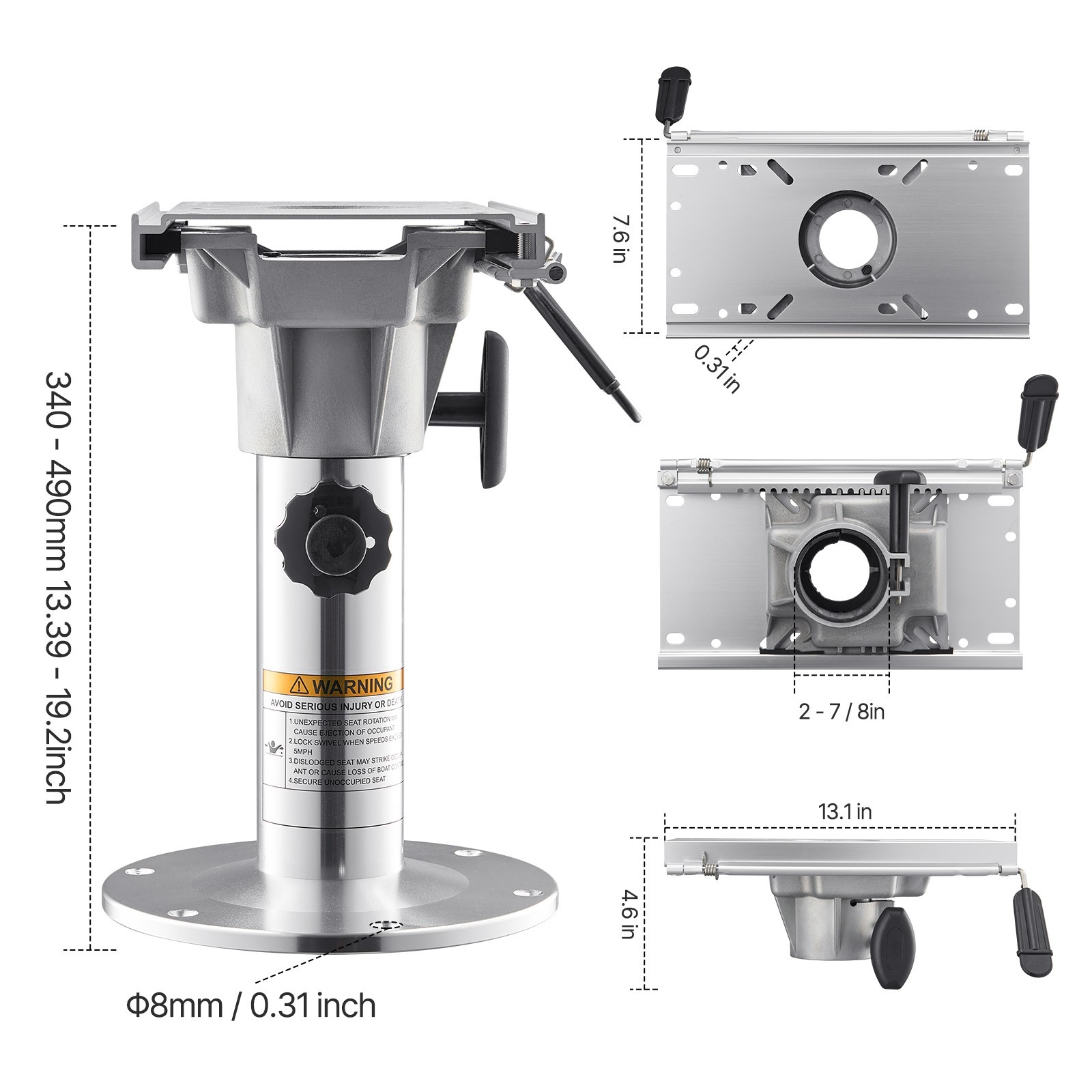 Features & Details Three Flexible Adjustments: The boat seat pedestal provides 13.39-19.2 inch (340-490 mm) height adjustment, 360° angle adjustments, and forward/backward sliding to help you find the ideal seating position. Enjoy enhanced comfort and a better view! Aluminum Alloy Construction: Our adjustable boat seat pedestal is made from heavy-duty aluminum alloy, providing increased support and durability. The thickened aluminum resists deformation and the waterproof features avoid corrosion, making it great for outdoor and marine environments. Universal Installation:Pre-drilled holes on the adjustable boat seat base make it easy to attach to your deck. Just align the holes with the components and secure the base in place. Note: Stainless steel screws are required for installation (not included). Knob Locking: Quickly lock the adjustable boat seat mount height and angle with the knob to avoid wobbling, improving stability and keeping you comfortable during use. Widely Compatible: This versatile boat pedestal fits many types of boat seats, letting you enjoy water sports like fishing and boating on fishing boats, yachts, canoes, and more!
