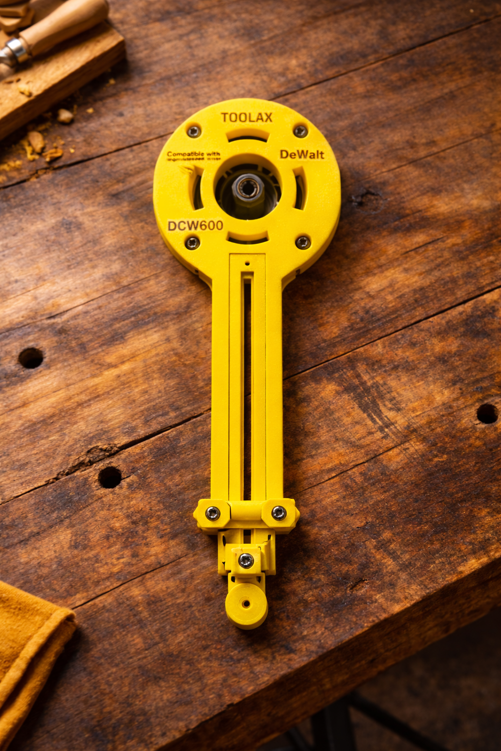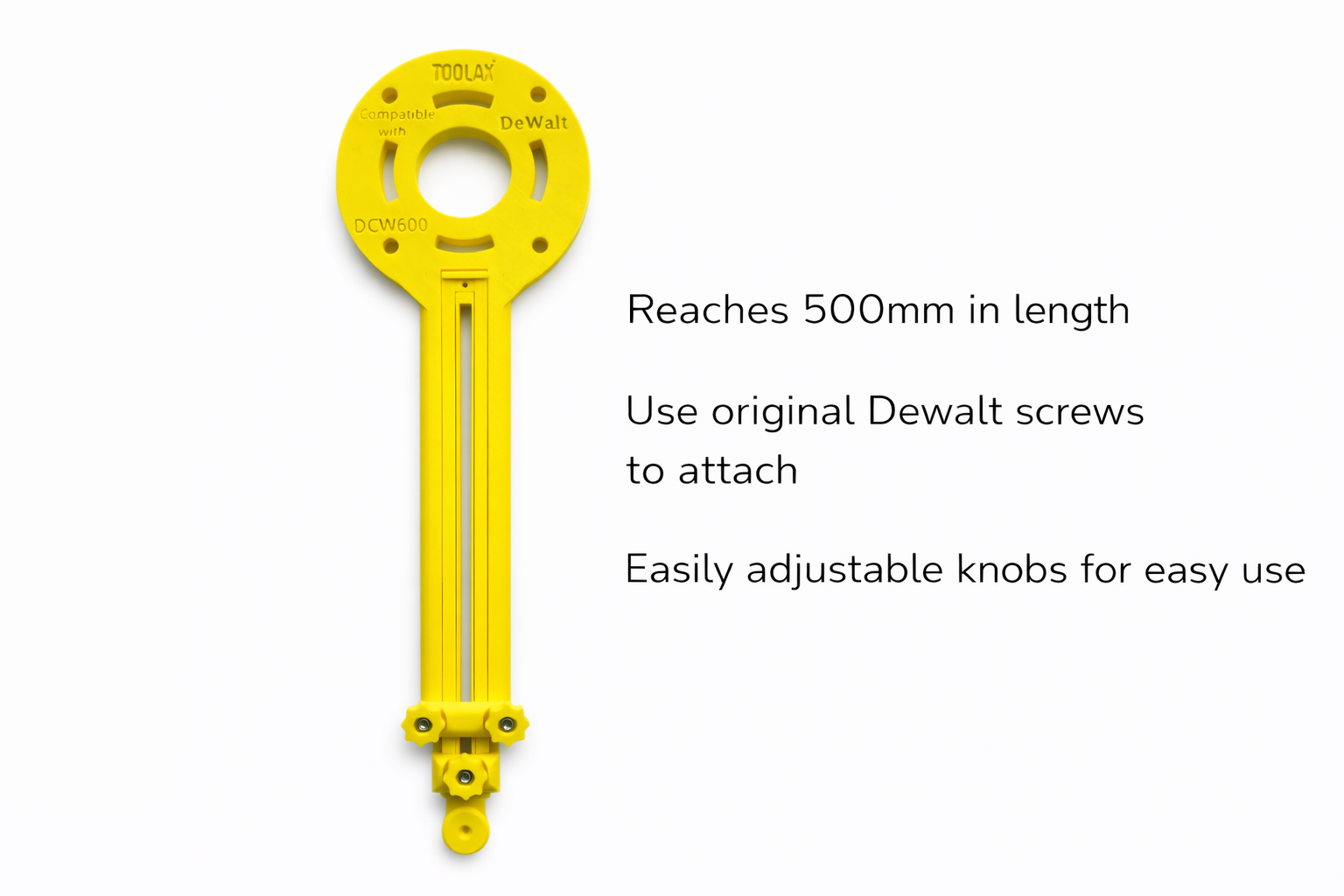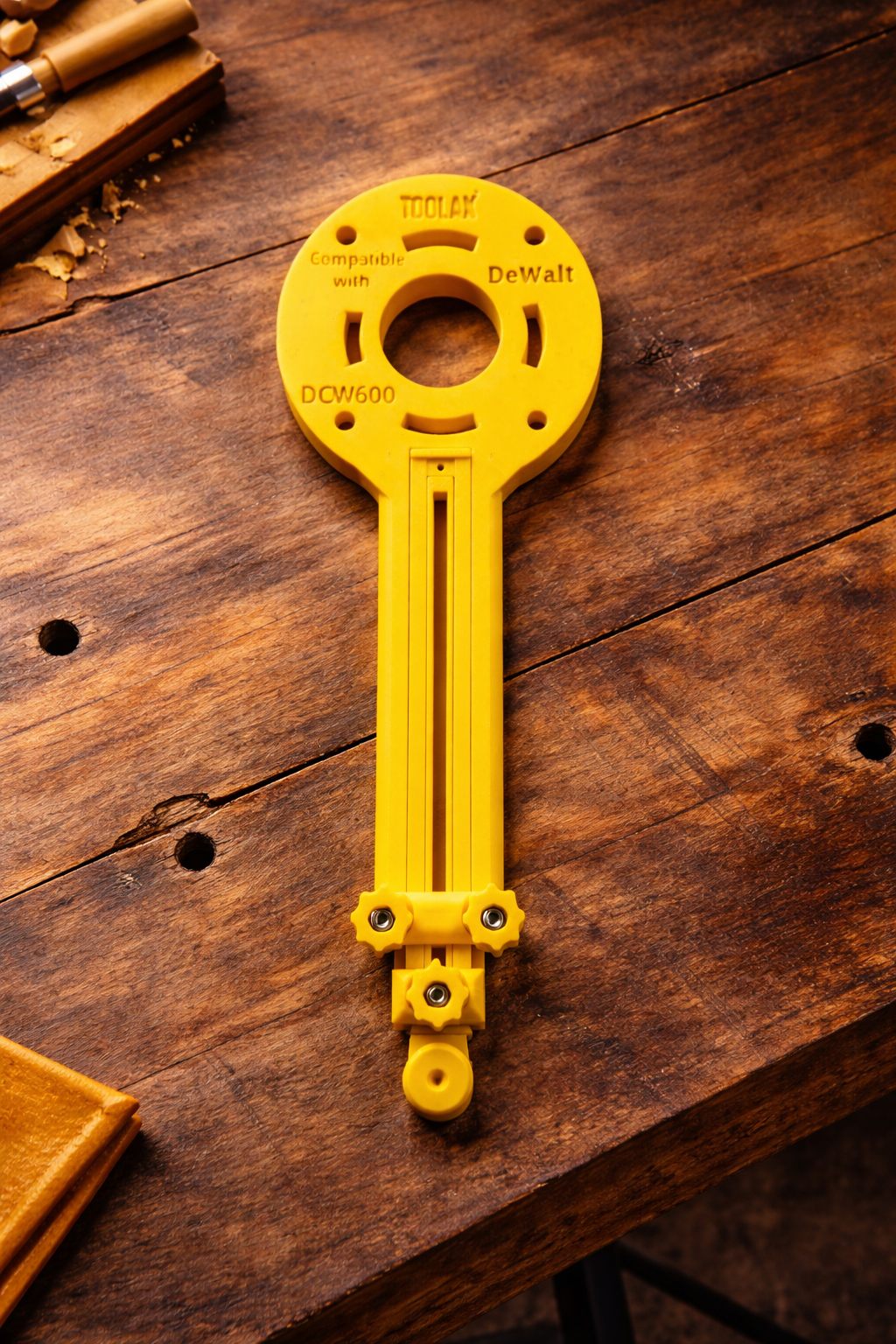 TOOLAX Adjustable Circle Cutting Jig (up to 500mm) Fits the following Dewalt Routers: DCW600 DCW604 DWP611 D26200 (Uses original Dewalt base screws for secure fitting) Create clean, accurate, and repeatable circles with ease. . Ideal for routing perfect circles, rebates, and grooves in woodworking projects, cabinetry, speaker builds, and custom joinery. Key Features ✅ Designed for Dewalt DCW600 DWP611 – Direct fit using the original screws ✅ Adjustable Diameter – Unique Easy slider adjustment with hold-down thumb screw - extends to 500mm ✅ Smooth & Accurate Operation – Enables controlled, consistent circle routing Cutting Capacity Maximum Cutting Diameter: 500mm Minimum Cutting Diameter: 30mm Simply set the desired diameter using the sliding scale, secure with the thumb screw, position your centre nail, and rout with confidence. Product Details Colour: Yellow Material: PLA (High-quality 3D printed construction) Made in the UK Brand: TOOLAX Not an OEM product