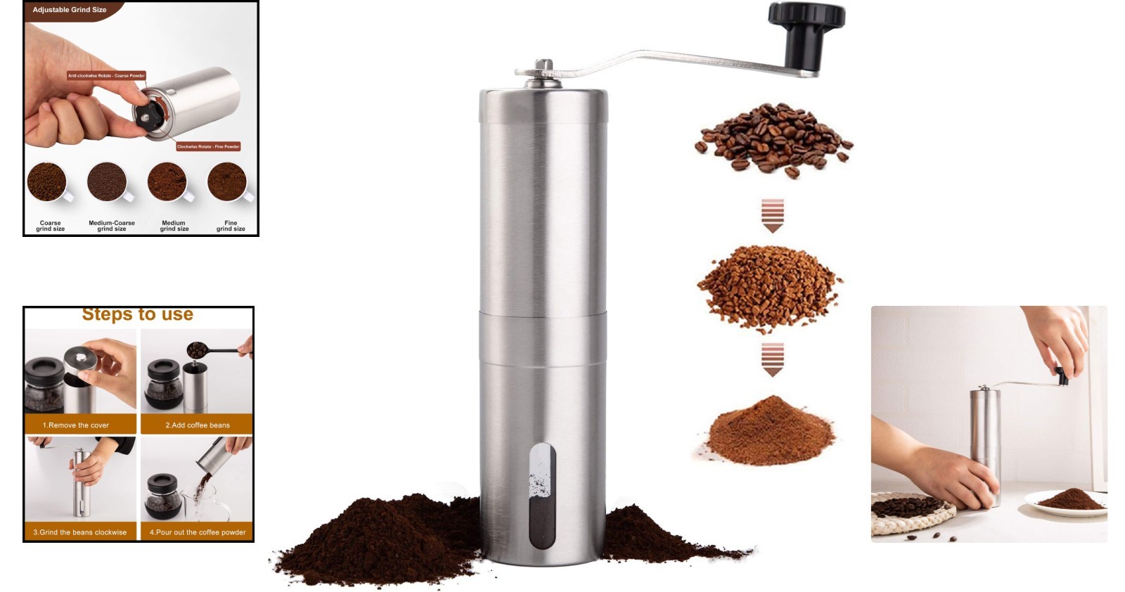 Adjustable Coffee Bean Grinder: Stainless Steel Hand Mill for Perfect Brew ‹ › ‹ › ‹ › ‹ › ‹ › ‹ › ‹ › ‹ › ‹ › Adjustable Coffee Bean Grinder Stainless Steel Hand Mill for Perfect Brew Product Description: Indulge in the rich, aromatic world of freshly ground coffee with our Adjustable Coffee Bean Grinder, expertly crafted from 304 stainless steel. Featuring a ceramic burr, this hand mill not only grinds with precision but also preserves the true essence of your coffee beans, ensuring a delightful brew every time. Key Features: High-Quality Construction: Made from 304 stainless steel for durability and style. Ceramic Burr Grinding: Ensures a precise and uniform grind without overheating beans, preserving flavor. Adjustable Grind Settings: Easily customize your grind from fine to coarse; perfect for French Press, Drip Coffee, Espresso, and Turkish Brew. Ergonomic Design: Lengthened handle maximizes leverage, minimizing effort during grinding. Easy Maintenance: Removable parts for thorough cleaning, ensuring every cup is fresh and flavorful. Portable and Convenient: Compact design makes it easy to carry to the office, camping, or on your travels. Why Choose Our Adjustable Coffee Bean Grinder? Your coffee experience deserves nothing short of perfection. With our Adjustable Coffee Bean Grinder, you are empowered to control the coarseness of your grind, unlocking the full potential of your coffee beans. Whether you're brewing at home or enjoying fresh coffee while camping, this grinder makes every cup an exceptional experience. Make the best choice for your coffee journey - add the Adjustable Coffee Bean Grinder to your kitchen today! Shipping Free & Fast Shipping - We offer free shipping to most of the USA with a normal delivery time of 3-7 days. However, due to the current situation, additional delivery time (up to 3 weeks) may be required for some items. Alternative Carriers - We may use alternative carriers (e.g. USPS, FedEx, UPS, etc.) to ensure your package arrives safely and on time. Due to the use of multiple carriers, we are unable to provide a tracking number automatically. Handling Time - Orders are processed and shipped within 1-2 business days of receiving cleared payment. Shipping Restrictions - Shipping to Alaska, Hawaii, Puerto Rico, Guam, and other US territories may incur shipping charges or delivery restrictions. Please contact us before ordering, or your order can be refunded/cancelled. State Restrictions - There may be restrictions based on your state of purchase. For example, certain items may not be shipped to California due to state regulations. Contact for Tracking Updates - If you require tracking updates or have any concerns about the delivery of your order, please feel free to contact us, and we will be happy to assist you. Return 30-Day Hassle-Free Returns - We want you to be completely satisfied with your purchase. If you are not, you can return the item within 30 days of receiving it for a full refund or exchange. Easy Return Process - To start a return, simply contact us and we will provide you with a prepaid return shipping label and detailed instructions. Restocking Fee - There are no restocking fees for returns. However, the buyer is responsible for return shipping costs if the return is not due to a seller's error. Refund Processing Time - Refunds will be processed within 5 business days of receiving the returned item in its condition. Payment We accept all major credit cards, PayPal, and Apple Pay for your convenience. Your payment information is secure and encrypted to ensure a safe and seamless transaction. Please complete your payment within 3 days of purchase to avoid any delays in shipping. Feedback Your feedback is extremely important to us. We strive to provide the best products and customer service possible. If you are satisfied with your purchase, please take a moment to leave us a positive review. If you have any concerns or issues with your order, please contact us before leaving negative feedback. We are committed to resolving any problems and ensuring your satisfaction. Contact Us If you have any questions or concerns, please feel free to out to our customer support team. You can contact us through the eBay messaging system. We are available Monday to Friday, 9:00 am to 5:00 pm EST, and we will do our best to respond to your inquiry within 24 hours. Buy it now and enjoy a pleasant shopping experience! Unit Quantity: 9.6 oz Components Included: Coffee Grinder,Manual Coffee Grinder Features: Easy to Clean,Lightweight,Portable,Adjustable Control,Removable Parts,Effort-saving Handle Type of Coffee Made: Coffee Bean Grinder Model: Coffee Bean Grinder Grinding Method: Burr Type: Hand Grinder Power Source: Manual Color: Silver Item Depth: 1.77 in Material: Stainless Steel Finish: Metallic Capacity: 140 milliliters Item Weight: 9.6 ounces