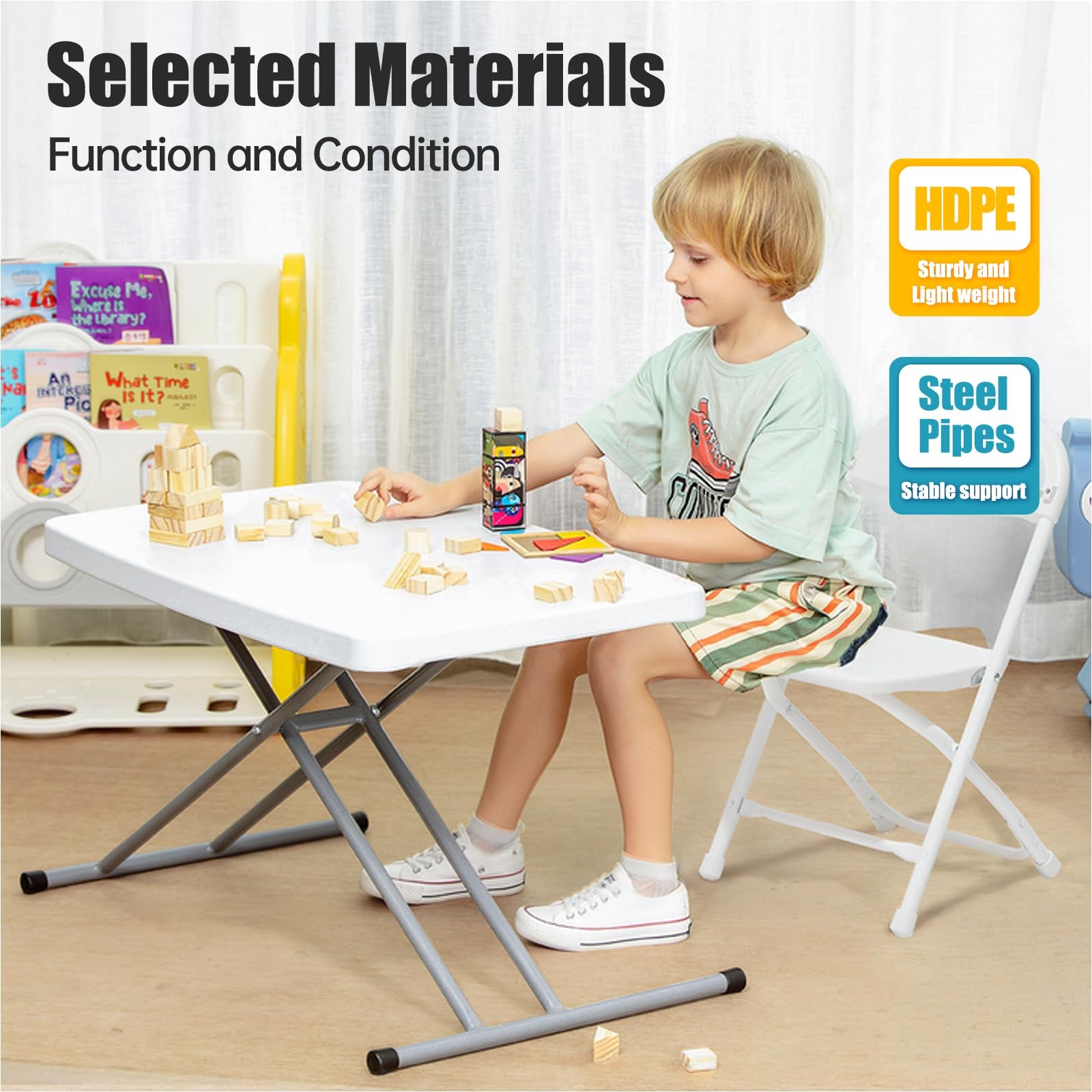 This adjustable folding table combines strength, portability, and convenience in a sleek modern package. Built from durable HDPE plastic and reinforced steel, it supports up to 110 lbs and adjusts to three comfortable height levels. Whether you’re working from home, setting up a picnic, or camping under the stars, this table offers the perfect balance of stability and flexibility. The foldable design makes it easy to carry or store, and the minimalist aesthetic complements both indoor and outdoor décor. From everyday meals to spontaneous adventures, this is the compact table you didn’t know you needed. KEY FEATURES Durable HDPE tabletop with powder-coated steel frame Load capacity: up to 110 lbs 3 height settings: 18.5", 25.2", 29.5" Tabletop size: 30.3" x 19.7" Foldable, compact design for easy storage Lightweight at just 8.15 lbs Triangular leg structure and crossbars for added stability Anti-slip feet and smooth rounded corners No tools required for setup APPLICATION Perfect for camping, picnics, RV trips, outdoor BBQs, beach days, backyard events, kids’ study sessions, or as a compact home office or side table. A practical solution for small apartments, patios, dorms, and travel. SPECIFICATIONS Material: HDPE, Steel Color: White Granite Finish: Spray molding Style: Modern Shape: Rectangular Mount Type: Freestanding Foldable: Yes Height Options: 18.5", 25.2", 29.5" Tabletop Dimensions: 30.3" x 19.7" Weight Capacity: 110 lbs Net Weight: 8.15 lbs Number of Height Grooves: 8 Users: Approx. 2 people Assembly Required: Yes PACKAGE INCLUDES 1 × Folding Table IMPORTANT NOTES Do not exceed the maximum weight capacity. Items shown in images are for demonstration only and not included. Use on a flat surface to ensure stability. Whether you're short on space, always on the go, or need a reliable surface for everyday tasks, this adjustable height folding table delivers the strength, flexibility, and ease-of-use you’re looking for. Practical, portable, and modern—add it to your setup today and enjoy convenient support wherever you need it. BUILT STRONG FOR DAILY USE: Crafted from high-density polyethylene and supported by a powder-coated steel frame, this folding table resists shock, pressure, and daily wear. The honeycomb-patterned top adds strength while keeping the weight low, making it reliable for both indoor and outdoor use. STABLE SUPPORT WITH HIGH LOAD CAPACITY: The reinforced triangular structure, thickened steel legs, and crossbars allow this table to hold up to 110 lbs without wobbling. Non-slip feet protect your floors and keep the table steady during meals, work, or play. ADJUSTABLE HEIGHT FOR VERSATILE COMFORT: Easily switch between three height levels—18.5", 25.2", and 29.5"—to match different chairs, tasks, or users. Whether you're working on a laptop, having dinner, or crafting, this adjustable table ensures ergonomic support and a better sitting posture. SPACIOUS TOP, COMPACT FRAME: With a generous surface area of 30.3" x 19.7", the table provides ample room for meals, devices, or art supplies. Weighing only 8.15 lbs and folding flat, it's easy to transport to campsites or store in closets and car trunks. QUICK SETUP WITH A CLEAN DESIGN: Assembly is fast and intuitive—just unfold and lock into place. Smooth White Granite finish, rounded corners, and sleek lines add a modern touch that fits seamlessly in homes, patios, or outdoor venues.