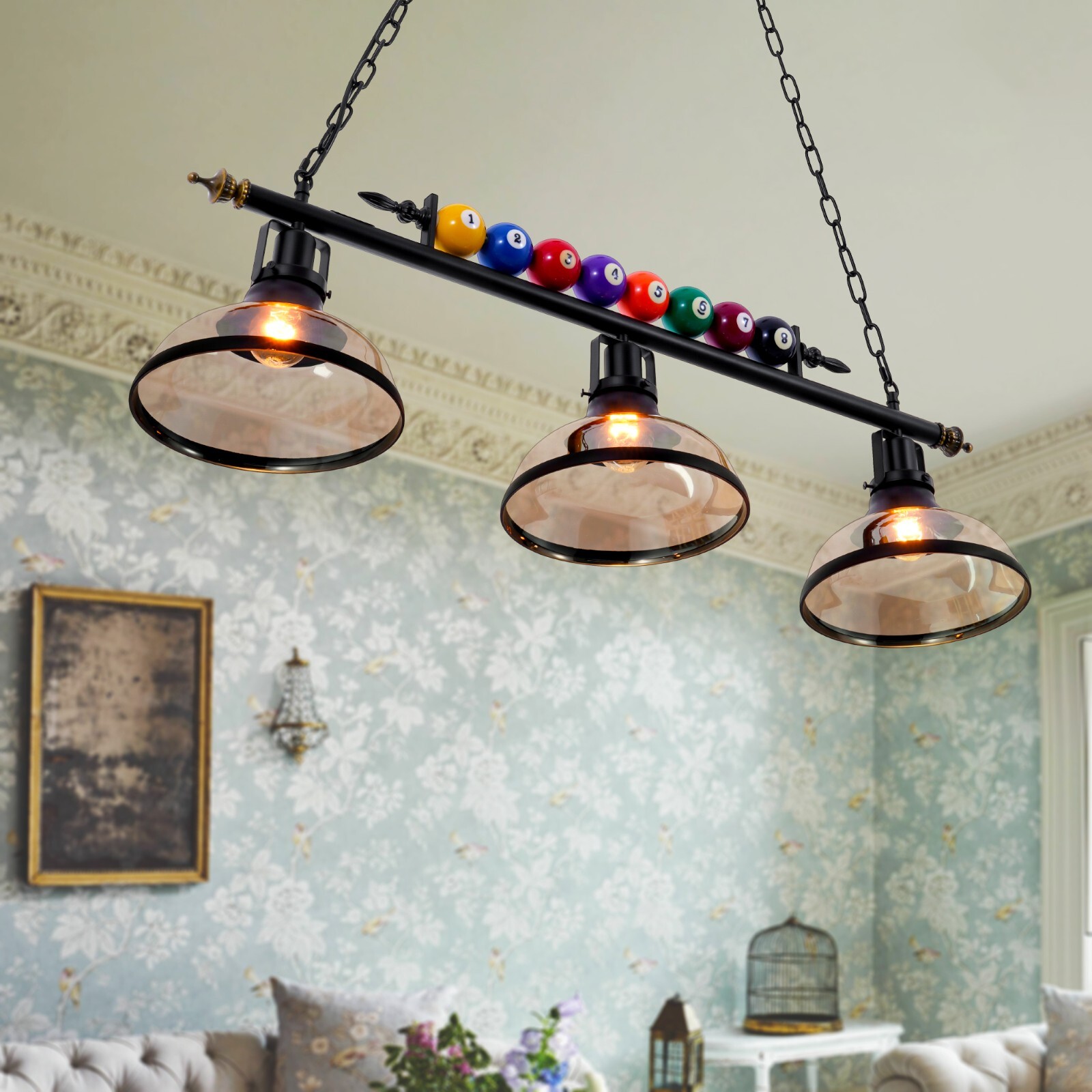 Pool Table Pendant Light Adjustable Billiard Lights Hanging Lighting Industrial Specifications Full installation Dimensions: Width:37.8in, Height:43.3in Bulb Type: LED/CFL/Incandescent Bulb Base: 3*E26 Bulb Not Included Material: Metal+glass Finish: Black Lampshade color:Amber Shade Material: Glass Packaging details 1 * light pack in foam carton box.(Neen assembly) Suggestion: Installation By A PROFESSIONAL ELECTRICIAN Assistant after sales: For any question or installation methords about the light fixture,pls contact us via ebay message firstly for help. Warm Tips For a safe and secure installation, please ensure that the electrical box to which this fixture will be mounted is properly attached to a structural member of the building. Do not connect electricity until your fixture is fully assembled We kindly suggest you contact a professional electrician directly. About this item Bulb Base: E26, Max Power for Each Bulb: 40W, Bulb Type: LED/incandescent lamp/fluorescent lamp Perfect for the pool table. Bring enough lights and bring the right atmosphere. Fixture Width: 37.8 inch (96 cm),Fixture Height: 43.3 inch (110 cm),Chain/cord Length: 33.5 inch (85 cm), Chain/Cord Adjustable, you can adjust the hanging height as you like. The Best Choice for Your Home Decor:Perfectly feel various decoration styles : Industrial Style, Loft Style, Vintage style and also Contemporary style. Payment Delivery details Terms of sales About us Contact us Payment You could make payment via: Delivery details Packages will ship via by UPS or USPS within our handling time,once the package is shipped out ,normally shipping takes about 3-10 working days,but due to different cities and states,shipping time will be different. Terms of sales If you any problem about shipping information, or the item you got : Arrived damaged; Wrong item sent; Missing parts or pieces; Doesn't work or defective; Doesn't match description or photos. Pls click "Contact Seller" and send us message firstly. Then we could have a check and will take responsibility to resolve the problem with you in good communication. About us Our company specializing in selling all kinds of light fixtures,such as ceiling fans,chandeliers,crystal lights,retro lamps,pendant light,etc. If there's any light fixture you are interested,pls feel free to contact us for more details. Contact us Normally your message will be replied in 1 business day,If after 24 hours you do not receive our reply,please kindly re-send us the message,because sometimes ebay message system will have technical problem,so your message can't send to us successfully.