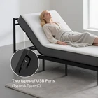 Adjustable Bed Frame with Massage Head & Foot Incline Split King Size Wireless Remote, two types of USB ports: Type-A and Type-C, LED Night Light, 4 Height-Adjustable Legs Easy assembly Features Massage: There are five modes to switch between, and the head and foot parts can be massaged independently.you can target specific areas to relieve muscle tension, reduce stress, and promote better circulation—all controlled via the included remote. Under-bed nightlight: No need to fumble for the light in the dark at night. Its soft glow illuminates the area under the bed, allowing you to easily find your slippers. Convenient charging: Equipped with both Type-A and Type-C ports on the left side, it effortlessly handles charging before bed or keeping devices powered up during late-night binge-watching sessions. Say goodbye to the hassle of tangled cables – it’s practical and worry-free. Sturdy bed legs: Equipped with 8 bed legs, the bed frame is made more stable. Moreover, the bed legs are adjustable in 4 sizes, namely 3",6",9",12" Wide mattress compatibility: Easily compatible with various types such as latex mattresses, memory foam mattresses, and hybrid mattresses. The mattress fixing rods can prevent the mattress from sliding. Effortless assembly: Despite the bed frame looking complicated, the assembly process is extremely simple and takes approximately 5 minutes. No tools are required, and all the accessories you need (even including batteries) are included. Easy to carry: It can be directly placed in the car's trunk. Thanks to its compact packaging upon delivery, it is convenient to carry up and down stairs. Descriptions massage electric bed frame This bed frame offers a total of five massage modes for you to choose from freely. three-fold design The triple-fold (or three-fold) design results in a smaller package and lower final-mile shipping costs. Additionally, customers can easily move and relocate the product after receiving it. USB ports Two types of USB Ports(Type-A,Type-C) under-bed night light The under-bed night light allows you to easily find your slippers on pitch-black nights and brings some light to the darkness.