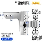 Item Description Material: Aluminum Ball Size: 2" and 2-5/16" Adjustable Height: 10" / 6"/ 8" Drop Distance (Adjusts in 1" Increments) Loading capacity: 2" Ball-8,000 LBS, 2-5/16" Ball -18,500 LBS Pin Hole Diameter: 5/8" Compatible with: Vehicles with 2.5 " Hitch Mounts Package Includes: Adjustable Steel Tailer Shank, Hitch Ball ( 2" And 2-5/16"), 2 Pin Lock
