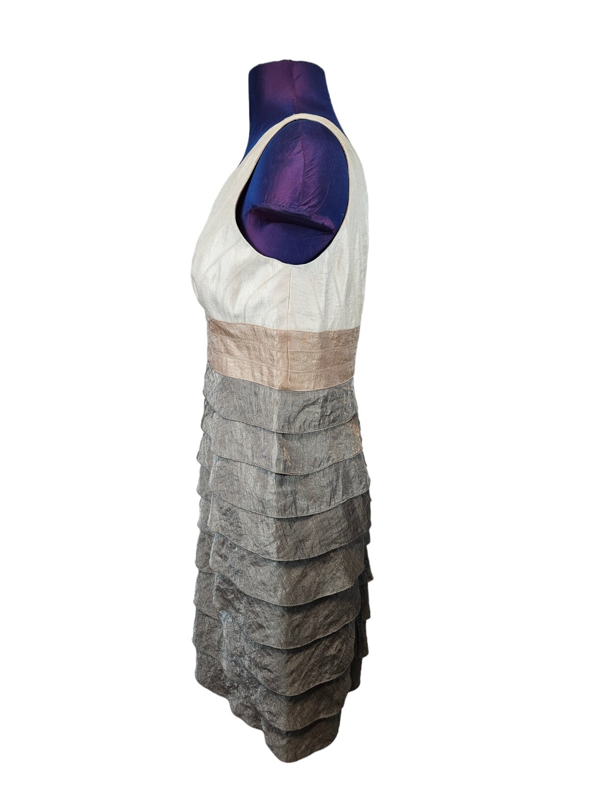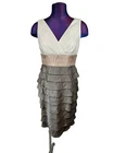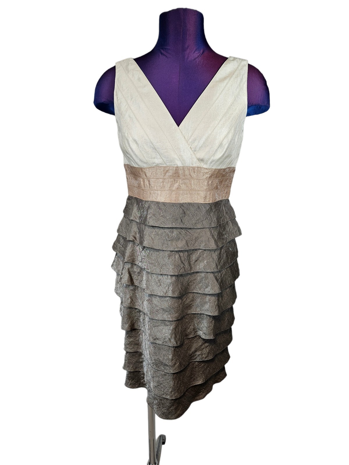 Adrianna Papell Iridescent Metallic Ruffle Tiered Cocktail Dress Size 6P Q60 In excellent condition Adrianna Papell Iridescent Metallic Ruffle Tiered Cocktail Dress Size 6P Women's Petite. This is a beautiful knee-length tiered cocktail dress by Adrianna Papell Occasions! Simple and elegant, this retro style has a crossover bodice and a ruffle tiered skirt. The dress is fully lined and has a back zipper closure with a hook and eye at the top. The fabric is a gorgeous iridescent ivory, gray, and taupe. Appropriate for everything from clubbing to an office cocktail party, shimmer and/or shimmy the night away! Measurements laying flat chest 15.5" length 36" waist 14.25" hips 19" Fabric rayon and polyester This is a pre-owned item that may show signs of wear. In excellent condition, no flaws. 14 Day returns accepted under the following conditions: Item must be in the same condition as stated If item shows additional wear buyer will receive a partial refund Buyer pays all shipping costs Refund amount will be for the item price only Please contact me prior to starting a return