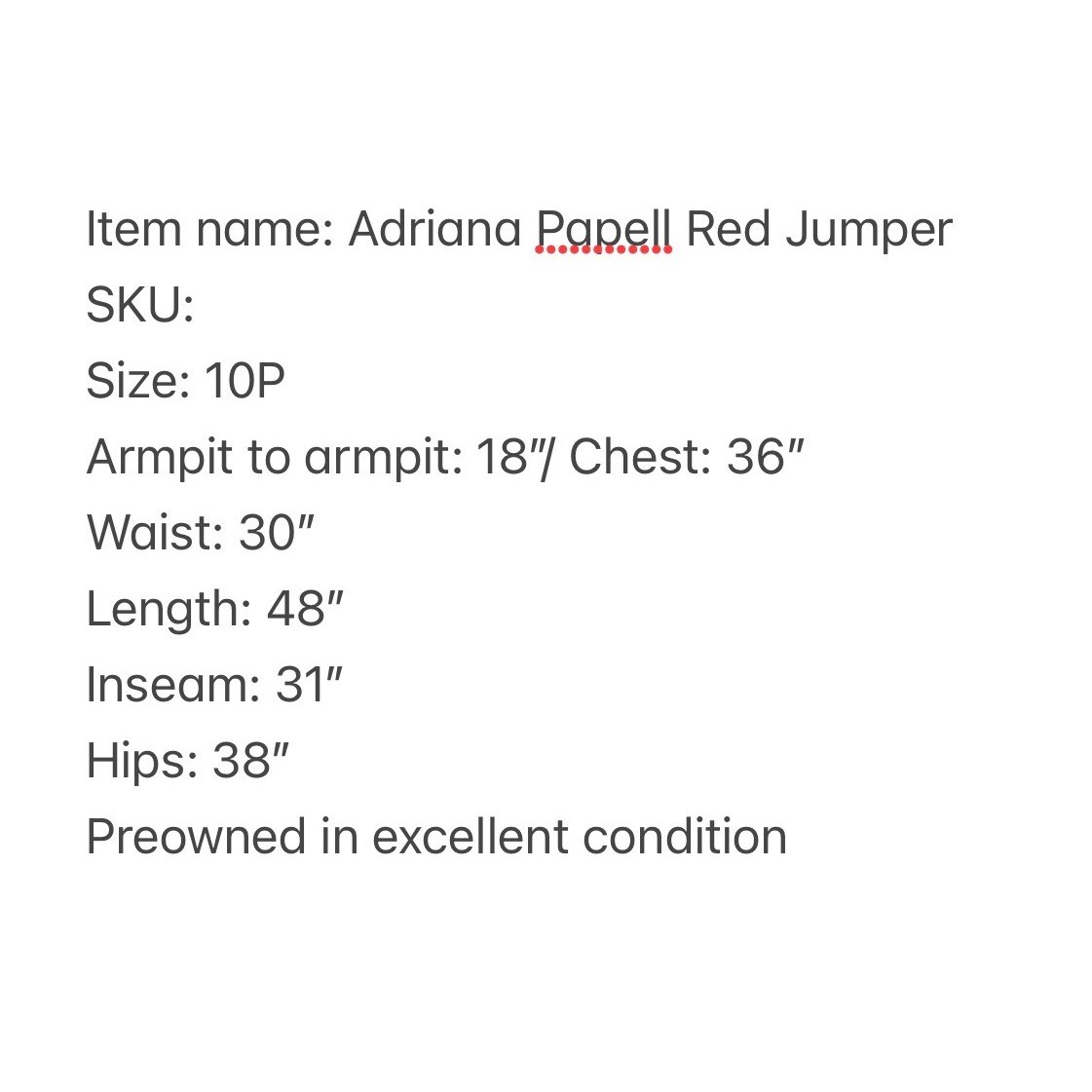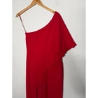 One-shoulder jumpsuit strikes a sophisticated balance with a dramatic draped overlay and a sleek wide-leg silhouette. Vibrant red crepe fabric offers a refined texture, while the asymmetrical neckline and single flutter sleeve create a modern, architectural look. A concealed side zipper ensures a smooth fit through the bodice, leading into a flattering wrap-style front detail on the trousers. Preowned in excellent condition. Measurements: • Armpit to armpit: 18" • Chest: 36" • Waist: 30" • Hips: 38" • Inseam: 31" • Total Length: 48" Size; 10/P Brand: Adrianna Papell Style: One Shoulder Jumpsuit Color: Red Neckline: Asymmetrical Sleeve: Single Flutter Sleeve Leg Style: Wide Leg Closure: Side Zipper Material: Crepe Occasion: Formal / Evening Fit: Petite Accent: Draped Overlay Gala, Wedding Guest, Cocktail, Statement, Minimalist, Chic, Holiday, Party, Sophisticated, Modern, Bold, Elegant, Special Occasion, Quiet Luxury • I ship within two business days. • All items come from a pet-free, smoke-free home. Thanks for shopping at Second Harvest Shop! Your support means the world to us.