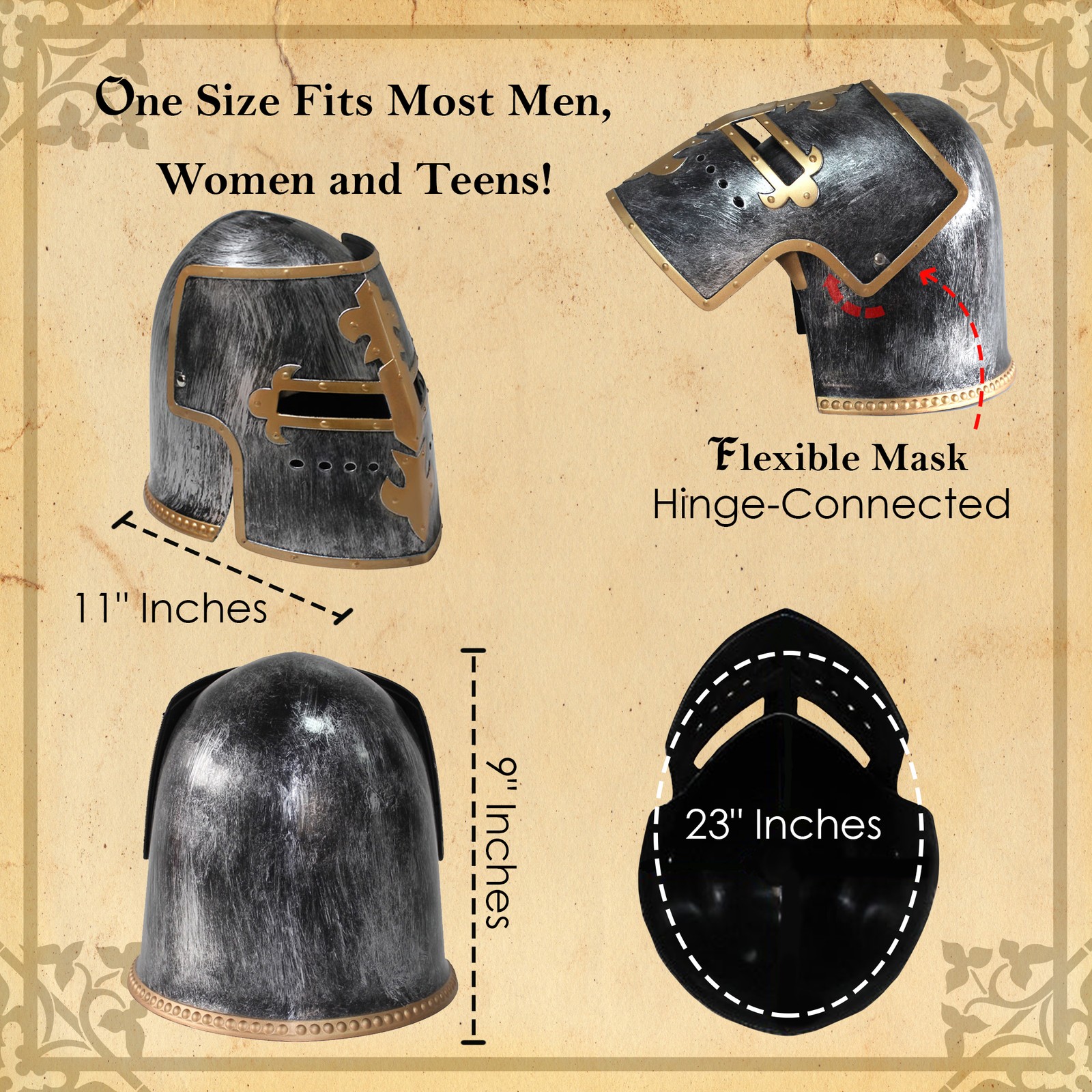 Adult Knight Crusader Templar Costume Medieval Viking Helmet Moving Visor Mask Pewter Medieval Knight Helmet by Nicky Bigs Novelties Thick Plastic Medieval Knight Helmet with Folding Face Mask Front. Adhesive foam strips or gluing foam strips on the inside can help for comfort and adjusting the size to fit smaller heads. Outside Measurements are Approximately 9" W, 9"H, 10"D. The great helm or heaume, also called pot helm, bucket helm and barrel helm, is a helmet of the High Middle Ages which arose in the late twelfth century in the context of the Crusades and remained in use until the fourteenth century. They were used by knights and heavy infantry in most European armies between about 1220 to 1540 AD.In its simplest form, the great helm was a flat-topped cylinder of steel that completely covered the head and had only very small openings for the eyes and mouth. Later designs gained more of a curved design, particularly on the top, to deflect or lessen the impact of blows. Helmets may have slight scratches and paint splotches due handling and hand painting. For Ages 14 and Older. Chose between silver or gold or black. ****Celebrate life events with us**** Nicky Bigs Novelties is a Marsinos Costumes brand. Marsinos name has over 100 years of history and business in Canton Ohio. The Nicky Bigs Novelties brand has over 1,000 items with products for any event, celebration, or theme you can imagine. Our brand mission is to create or improve existing products using the best quality materials at the highest standards possible. Our customers, employees, and products make us the company we are! Product Details Brand Nicky Bigs Novelties Color Silver Size One Size Manufacturer Nicky Bigs Novelties Mpn Does Not Apply MEDIEVAL COSTUME: Our knight helmet, made from breathable plastic, has a realistic metal appearance. Enjoy the look and feel of medieval costume accessories! EASY ACCESS: This medieval helmet has front mask flips up and side hinges for your convenience. Be the life of the party in our flexible knight helmet! THE RIGHT FIT: Our knight helmet measures 23" round and 9" tall. Youll love the comfort, style, and realistic knight appearance. For ages 14 and older. AUTHENTICITY: Easily complement any knight costume with our durable plastic helmet. Made with scuffs and scratches, youll look like the real deal! BLACK KNIGHT ACCESSORY: Great for a knight costume, Renaissance fair, medieval faire, LARP, Larping, crusader costume, play battle, cosplay, or Halloween. Enjoy the endless costume possibilities! Visit Our eBay Store Please note: This item's color may vary due to inherent manufacturing variations or your computer monitor's color settings. The item you receive will be identical or substantially similar to the item pictured in this listing. Please ensure your shipping address is correct before placing your order. Due to high shipping volume and multiple daily USPS pickups (including Sundays), we may not be able to modify an address after the order is placed. Orders returned to us due to an invalid, insufficient, or failed delivery address may be subject to a restocking fee or reshipment costs at the buyer’s expense. We offer a 30-day return window for most items. Because many of our products are intended for single-use occasions, all returns must meet the following conditions to be eligible for a refund: Items must be new, unused, and in original packaging Returns must be initiated and processed through eBay’s return system Buyer is responsible for return shipping costs Items used for events (e.g., Halloween) and returned afterward may not be accepted Once your return is received and inspected, a refund will be issued minus any applicable fees. Please allow time for processing upon delivery. For the fastest and smoothest return experience, we recommend following the steps provided by eBay’s return center.