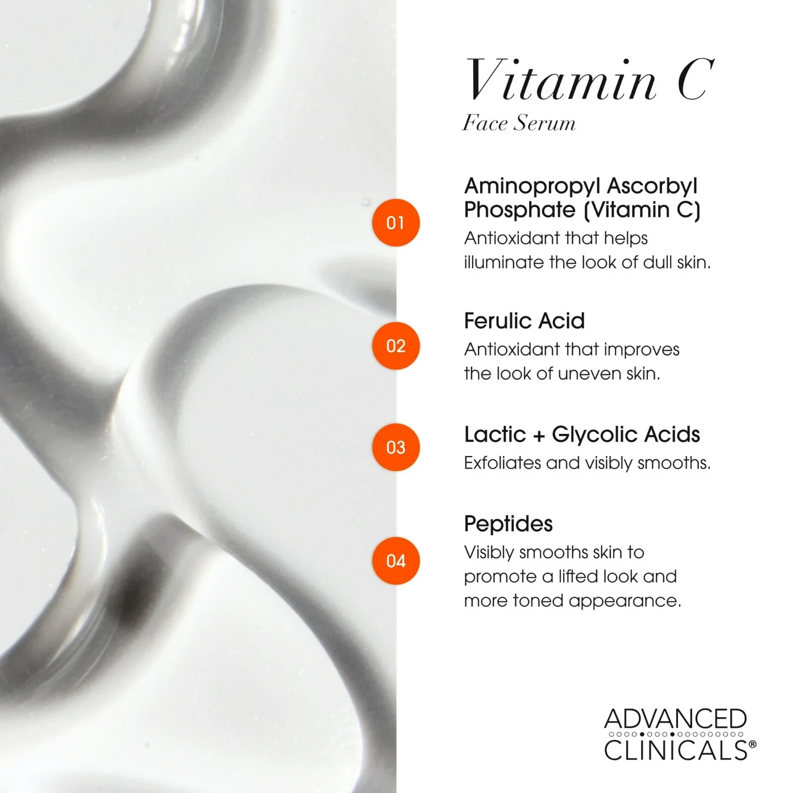 Advanced Clinicals Vitamin C Face Serum 1.75 fl oz Product details Vitamin C Anti-Aging is a potent serum infused with antioxidants that defend against environmental pollutants. Antioxidants work synergistically for effective absorption into skin. Highly advanced Vitamin C facial serum will feel instantly hydrating and therapeutic on your skin. Use after cleansing face and gently pat product onto skin, focusing on problem areas. Wait several minutes for serum to absorb. Follow with moisturizer. Can be used daily, morning and night. CONCENTRATED VITAMIN C SERUM FOR FACE – Visibly reduces the look of age spots. K3 Vitamin C lifts skin tone & reduces the look of pigmentation for healthier looking complexion. Soothing Aloe Vera hydrates skin while reducing irritation & dryness. Ferulic Acid, a natural antioxidant, supports a luminous, youthful radiance for a happier & healthier complexion. The blend of ingredients effectively helps to minimize the appearance of age spots, sun spots, dry skin, dark spots, scars, and more! INSTANT RESULTS- Instantly restores radiance and hydrates dry skin. Within 4 weeks reduce the look of age spots and firm delicate skin areas. Improves skin tones and diminishes the look of wrinkles. Encapsulated peptides target imperfections for a more uniform looking skin tone. POWERFUL ANTI-AGING PROPERTIES: Palmitoyl Oligopeptide is known to increase collagen production while reducing lines and wrinkles, improving skin texture, firming skin around the eye, brightening skin tone, and moisturizing the skin. And if that is not enough, Glycolic Acid is very effective in diminishing stubborn expression lines, acne, and oiliness. INFUSED WITH NATURAL INGREDIENTS- Paraben-free. Soothing Aloe Vera hydrates skin while reducing irritation and dryness on skin. Ferulic Acid, a natural antioxidant, supports a luminous, youthful radiance for a happier and healthier complexion. LARGE SPA SIZE BOTTLE- 1.75oz bottle will last you months. Just a few drops of this serum will immediately moisturize your skin and help eliminate unwanted age spots on your face or on your hands. Safe to use on neck and dcollet. Can be used on all skin types. Dry skin, oily skin or normal skin. PREMIUM FACE PRODUCT HOLDS PROMISE – Paraben-free. Not tested on animals. Advanced Clinicals assures your 100% satisfaction with this moisturizing anti-aging serum skin care set. Conquer deep wrinkles and lift sagging skin, or you will receive your money back CONCENTRATED VITAMIN C SERUM FOR FACE – Visibly reduces the look of age spots. K3 Vitamin C lifts skin tone & reduces the look of pigmentation for healthier looking complexion. Soothing Aloe Vera hydrates skin while reducing irritation & dryness. Ferulic Acid, a natural antioxidant, supports a luminous, youthful radiance for a happier & healthier complexion. The blend of ingredients effectively helps to minimize the appearance of age spots, sun spots, dry skin, dark spots, scars, and more!