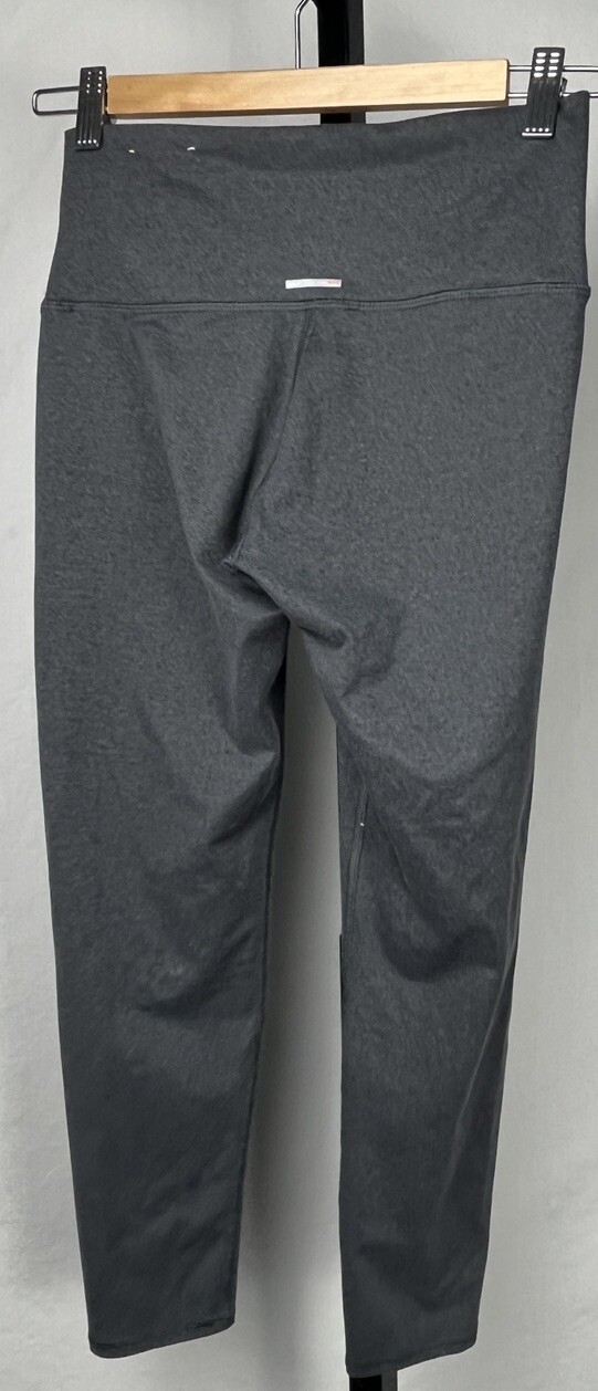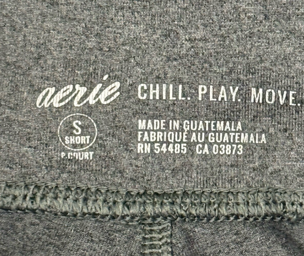 Aerie high-waisted gray leggings in women’s size Small Short. These pull-on leggings feature a wide waistband, hidden stash pocket, and tonal “Chill. Play. Move.” logo on back. Made with soft, stretchy polyester-elastane blend. Mid-crop fit (22" inseam), perfect for workouts, lounging, or casual athleisure. Details: Size: Women’s Small Short (short inseam) Waist (Stretch): 24"–32" Inseam: 22" Rise: 10" incl. 4.25" waistband Color: Gray Fabric: Polyester, Elastane (stretchy) Features: High rise, pull-on, stash pocket, slogan logo Condition: Excellent pre-owned Care: Machine washable