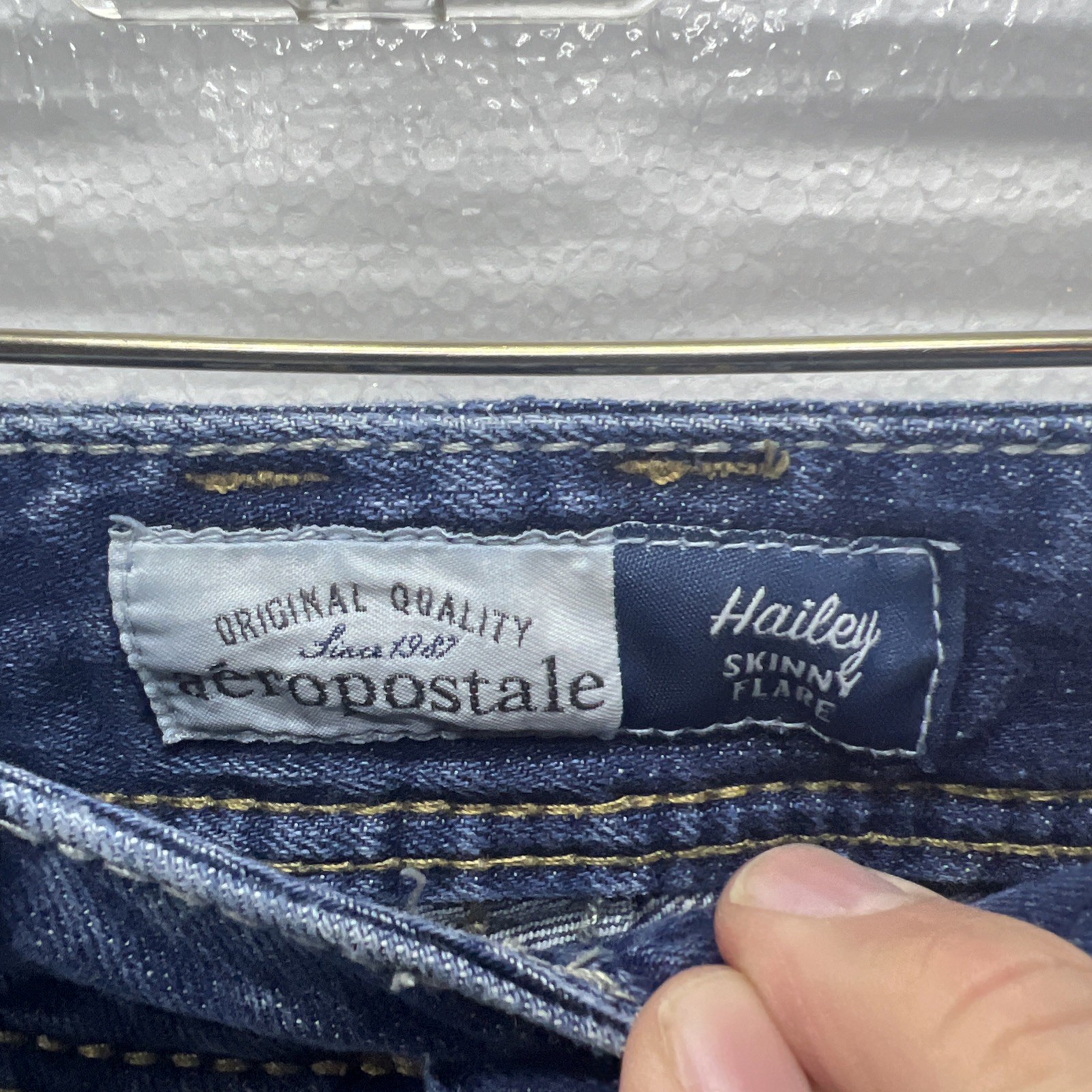 The product is a pair of Aeropostale Hailey Skinny Flare women's jeans in a 1/2 regular size. They are a low-rise, solid blue denim with a Y2K vintage look. The jeans feature a button, zipper closure, stretch fabric, 5-pocket design, and a flared style. The brand, Aéropostale, is known for its athletic fit, making these jeans a stylish and comfortable choice for teens and young women. Perfect for school, college, or casual wear, these jeans can be machine washed and are versatile for all seasons.