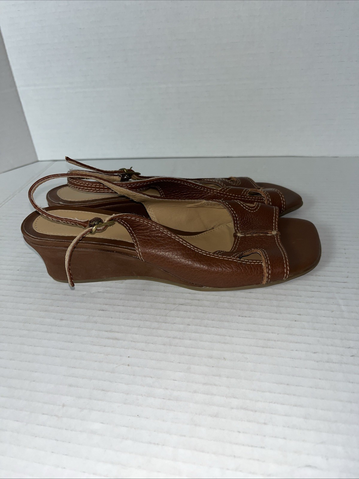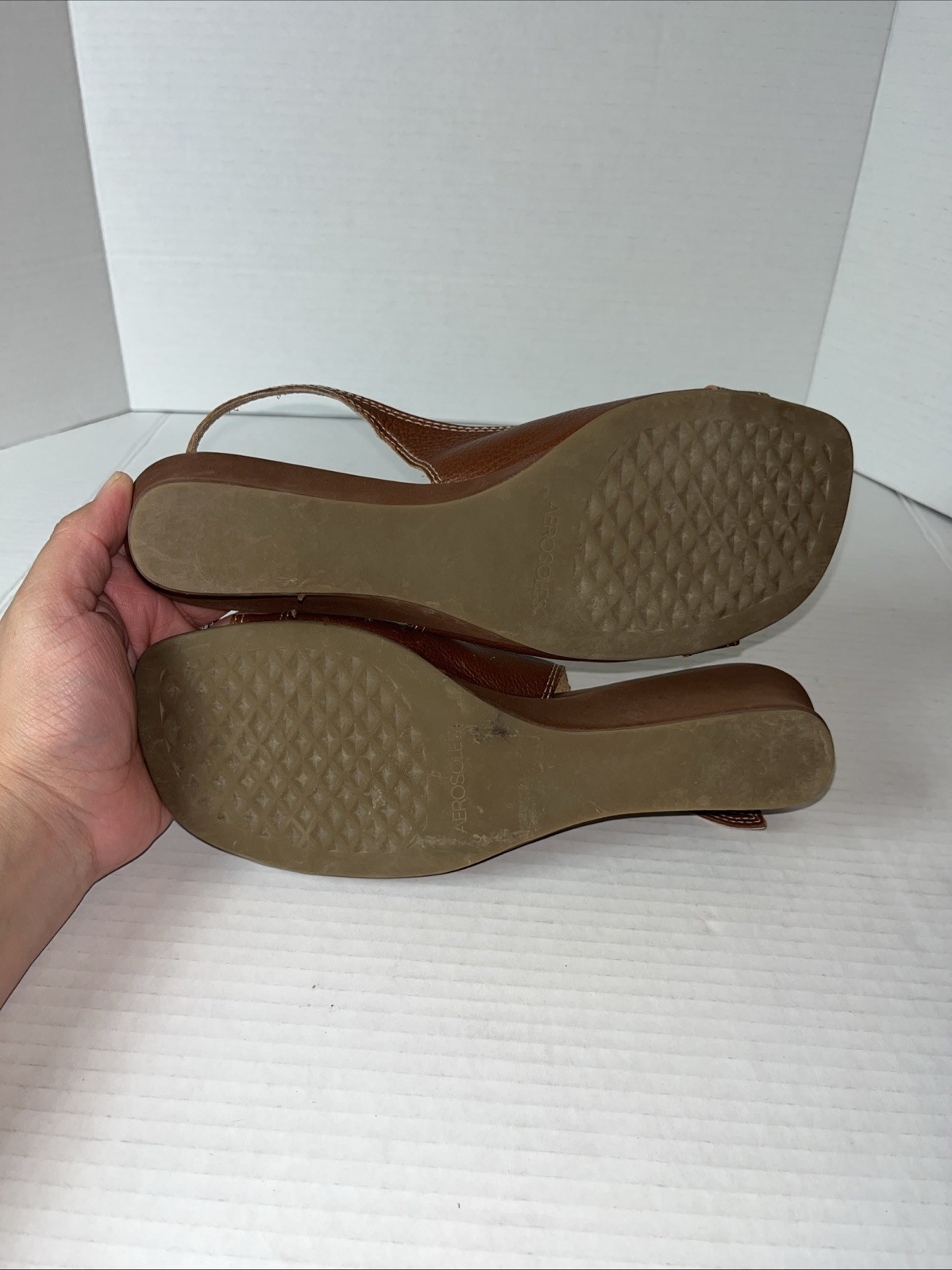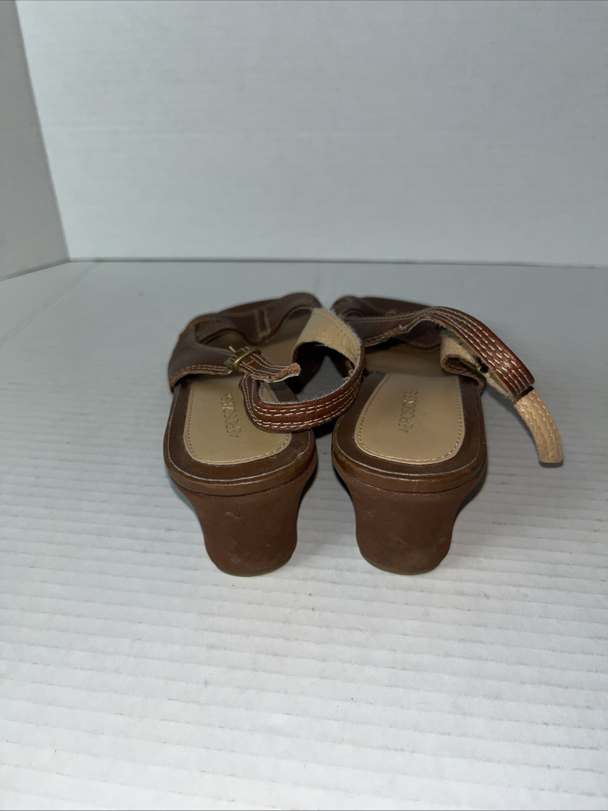 The Aerosoles Woman's Size 7.5 M Wedge Sandals with Buckle Closure are stylish and comfortable footwear perfect for casual occasions. These open toe shoes feature a solid brown color, mid-height wedge heel, and strappy design with a buckle closure for a secure fit. Made of leather, these lightweight and cushioned sandals are ideal for the summer and spring seasons. The bohemian theme adds a trendy touch to any outfit, making them a versatile and chic addition to any woman's shoe collection.