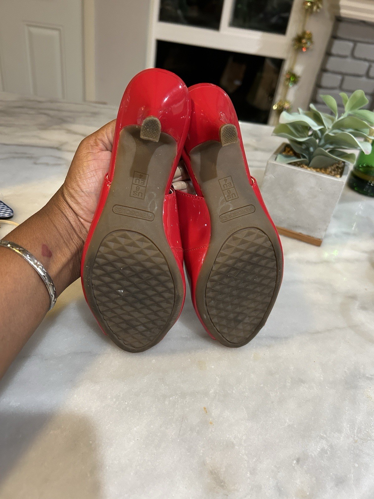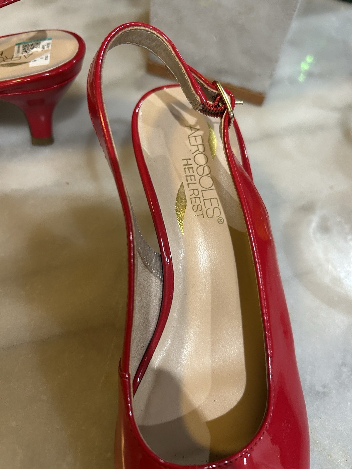 The product is a pair of red slingback heels by Aerosoles in size 6. These heels feature a solid pattern with a kitten heel style, making them suitable for casual occasions during the summer, fall, and spring seasons. Made of leather, these stylish heels are perfect for women looking for a trendy and comfortable footwear option. The slingback design adds a touch of elegance to the overall look, making these heels a versatile and chic addition to any wardrobe.