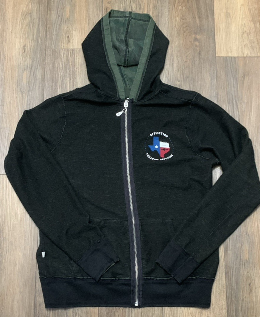 The Affliction Freedom Defender Reversible Full Zip Hoodie in Camo/Black is a versatile piece for men seeking both style and functionality in their activewear. With a reversible design, this hoodie allows for two different looks in one - perfect for those who love to switch up their style. The full zip feature and hood make it easy to layer over outfits, while the comfortable size M ensures a good fit for everyday wear. This hoodie is ideal for men who appreciate quality and unique details in their clothing choices.