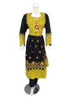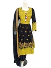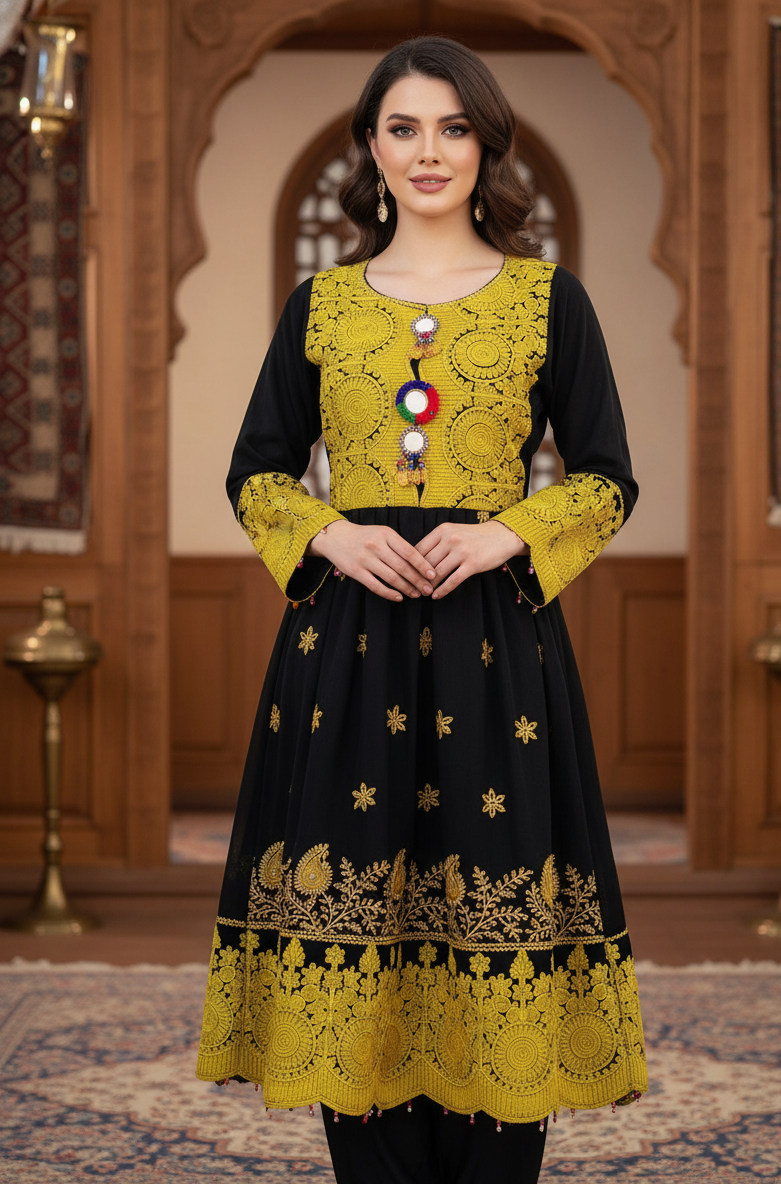 The frock is made of premium quality chiffon fabric with embroidery. The patchwork on the frock is done on velvet fabric with charma embroidery. The shalwar (pants) is made of silk, and its cuffs are adorned with gold-colored embroidery. The dupatta is also made of chiffon and features fancy gold-colored thread embroidery. The size of this dress is as follows: the length of the frock ranges from 45 inches to 48 inches, the chest of the frock is between 42 inches and 44 inches, and the waist is up to 40 inches. For better fitting, a waist belt has been added to the frock. The shalwar ranges from 36 inches to 38 inches. For more size details, you can send a message or provide your measurements in the message box while placing your order. Thankyou This Afghan traditional dress is a ready-to-wear cultural attire for women, featuring a charming charma patchwork pattern with long sleeves and a pullover closure. The dress is made from silk and chiffon materials, with embellishments, beads, and embroidery accents adding a touch of elegance. Perfect for various occasions like weddings, casual outings, and formal events, Eid, this knee-length shalwar suit in black color is designed to be one size and is handmade in Pakistan. The dress is lined, collarless, and comes with adjustable straps and a belted waist, making it a versatile and stylish choice for women looking to embrace their cultural heritage.