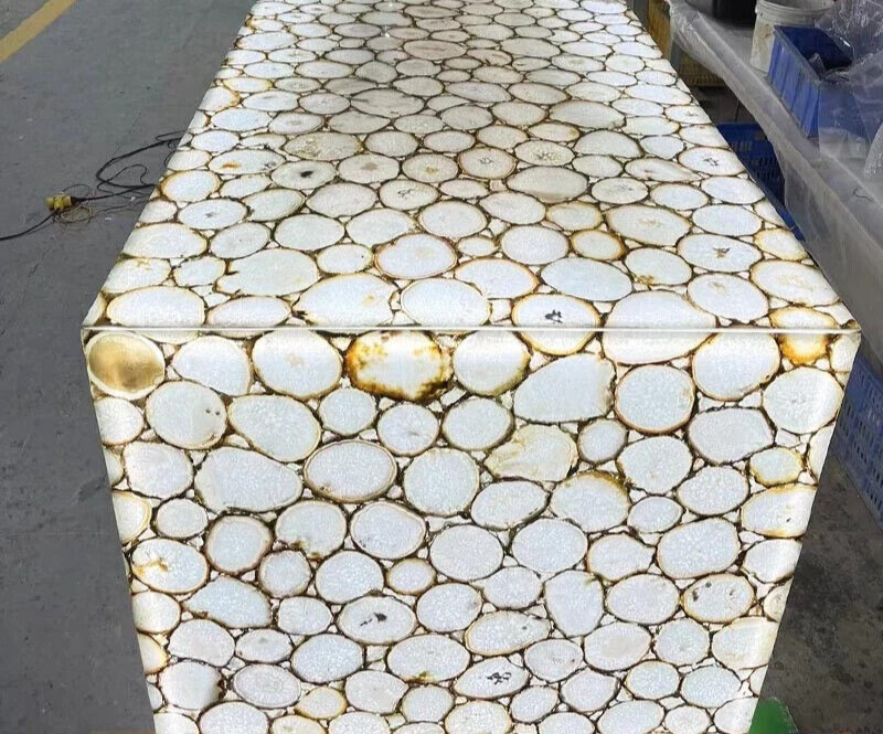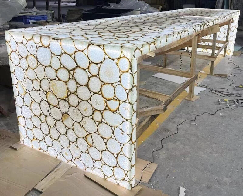 This product is a rectangular-shaped dining table made of natural white agate stone table top is 20-30 mm thick and polished to a high shine. It can be used as a vanity counter top slab or as a kitchen and dining countertop decor. The table is fixed and does not have any drawers. It is an original handmade product from India and requires no assembly. The agate stone handle finish adds to the table's art decor style. It is suitable for indoor and outdoor use and can be personalized. Key Features: Artistic Design : Each table top is a one-of-a-kind masterpiece, showcasing the vivid and swirling hues of agate in its natural form. the uniqueness of a agate table top—a timeless fusion of natural allure and refined craftsmanship that elevates any space with its unparalleled charm and beauty." Durable Construction: The tabletop is made from high-quality wood, providing a sturdy foundation for daily use. The agate stone not only adds a natural finish but also ensures longevity and protection against scratches and wear. Versatile Decor : Whether you have a modern, eclectic, or bohemian decor style, this table seamlessly fits into various settings. It's perfect for living rooms, dining areas, offices, or as a unique addition to your studio. Easy Maintenance : The item requires no additional parts or tools for assembly and can be easily cleaned with a damp cloth. Customizable Options : We understand the importance of personalization. Contact us to discuss custom color options, sizes, or specific design elements to ensure your table suits your unique taste and space requirements. Specifications: Very unique Art by Indian Artist ,Coffee/Side Table top Used Material: Natural Agate Stones Arts Size: 48"x36" Inches Color: White Shape: Rectangle Pattern: Handmade Room: Bedroom, Dining Room, Hallway, Home Office/Study, Kid’s Bedroom, Kitchen, Laundry/Utility Room, Living Room,Patio, Playroom Packaging: Wood & Foam Export Packing Shipping: Air Shipping and Packaging: Note:- This is Only table top/ Slab , Leg /base is not included , If you have any kind of query ,please message us * We can make the table top similar to this as it is handmade or natural process you will not get the same as shown in picture but you will get the similar one * The table top is made in Agra India & fully handmade. * The top will be delivered by FedEx or DHL free of cost door to door. * If there is any local tax, custom duties or Vat will be paid by the buyer at the destination. * The parcel is dispatch with proper packing & fully insured covering all kind of risk. Thanking You....
