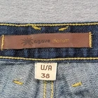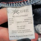 The product is a pair of men's Agave jeans in size 38, featuring a relaxed fit and a straight leg style. Made in the USA from dark wash Supima cotton denim, these jeans have a mid-rise waist of 36 inches. The zipper closure adds convenience, while the solid blue color and classic design make them a versatile addition to any wardrobe. The Agave Waterman jeans are crafted with high-quality materials and attention to detail, ideal for a comfortable and stylish everyday look.
