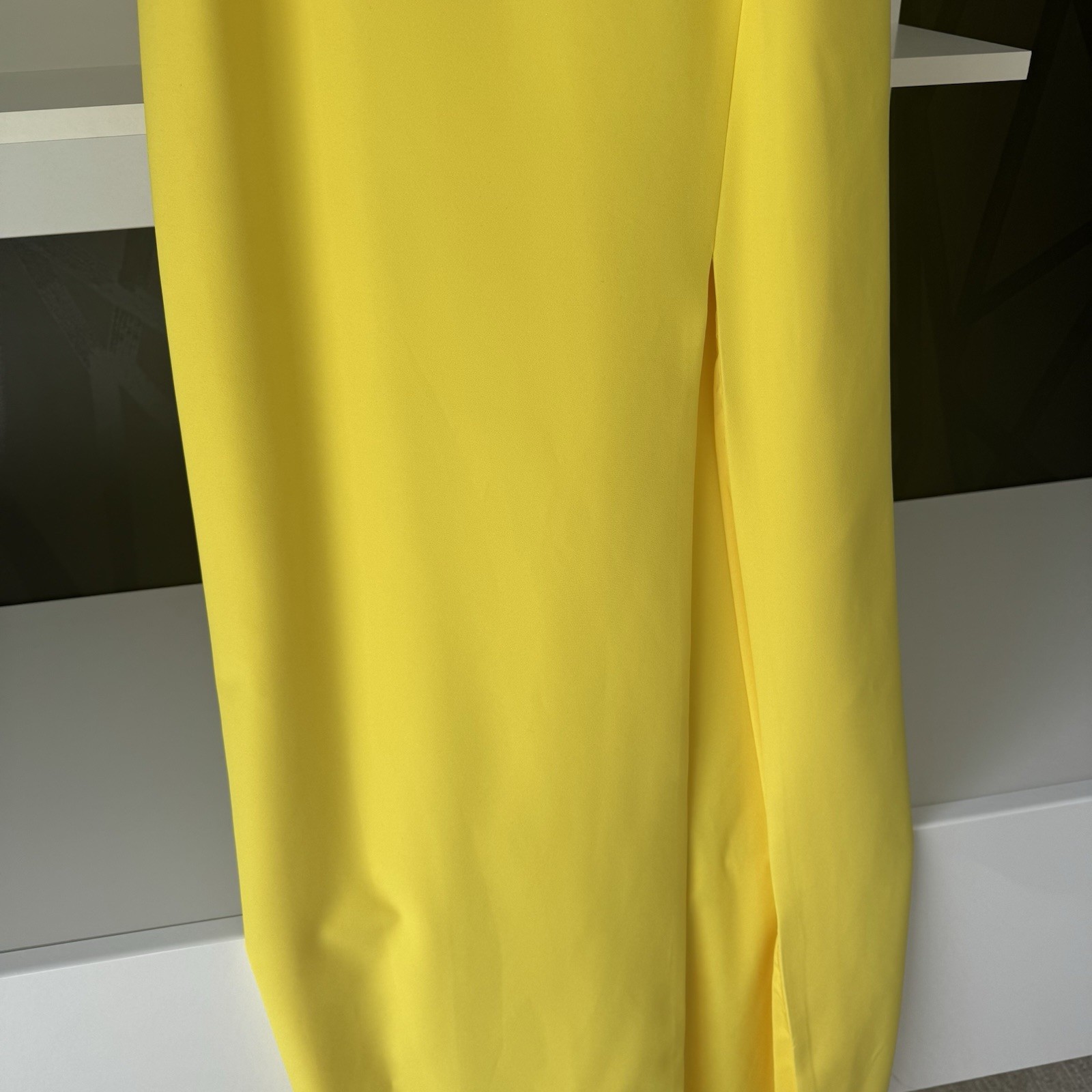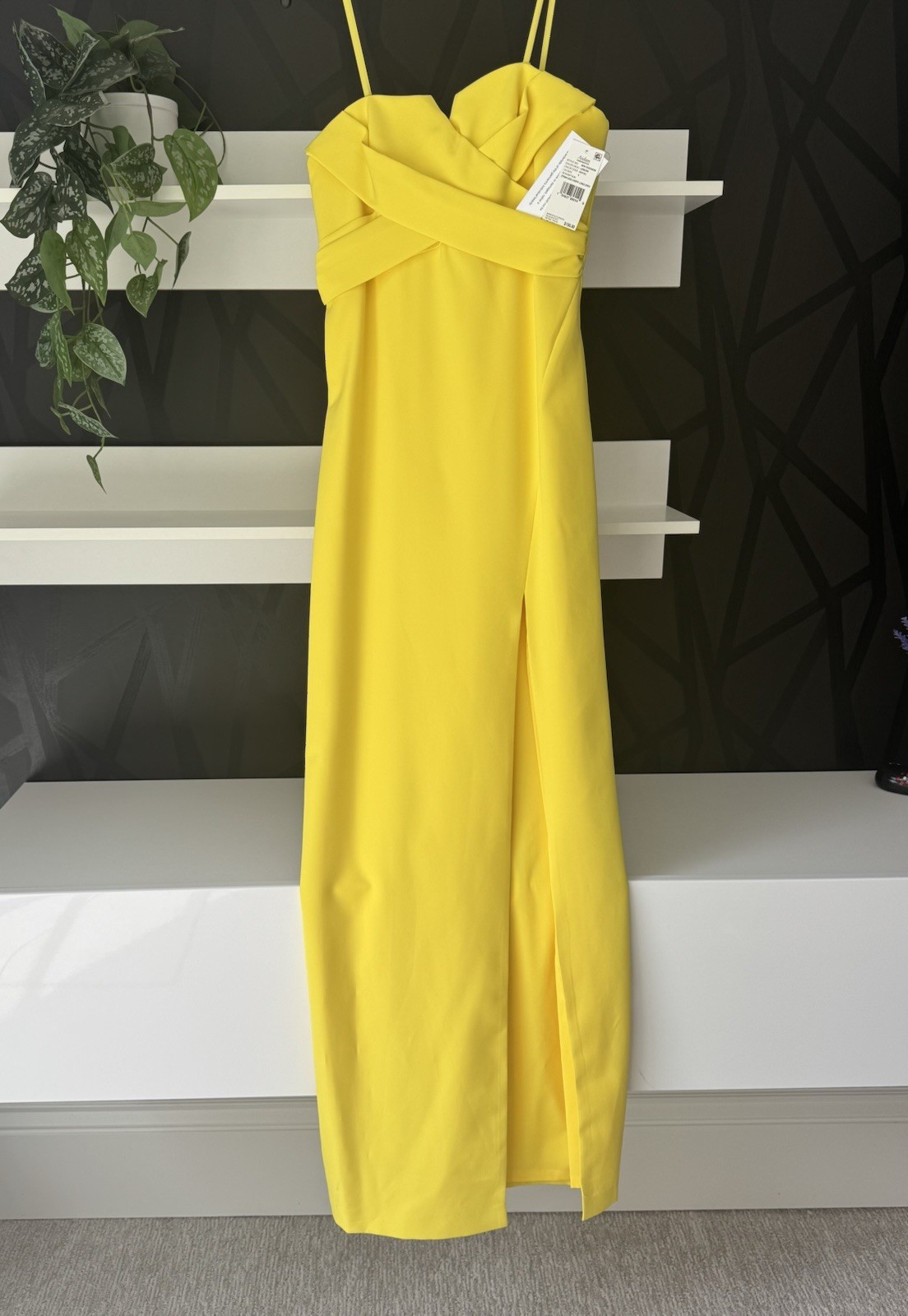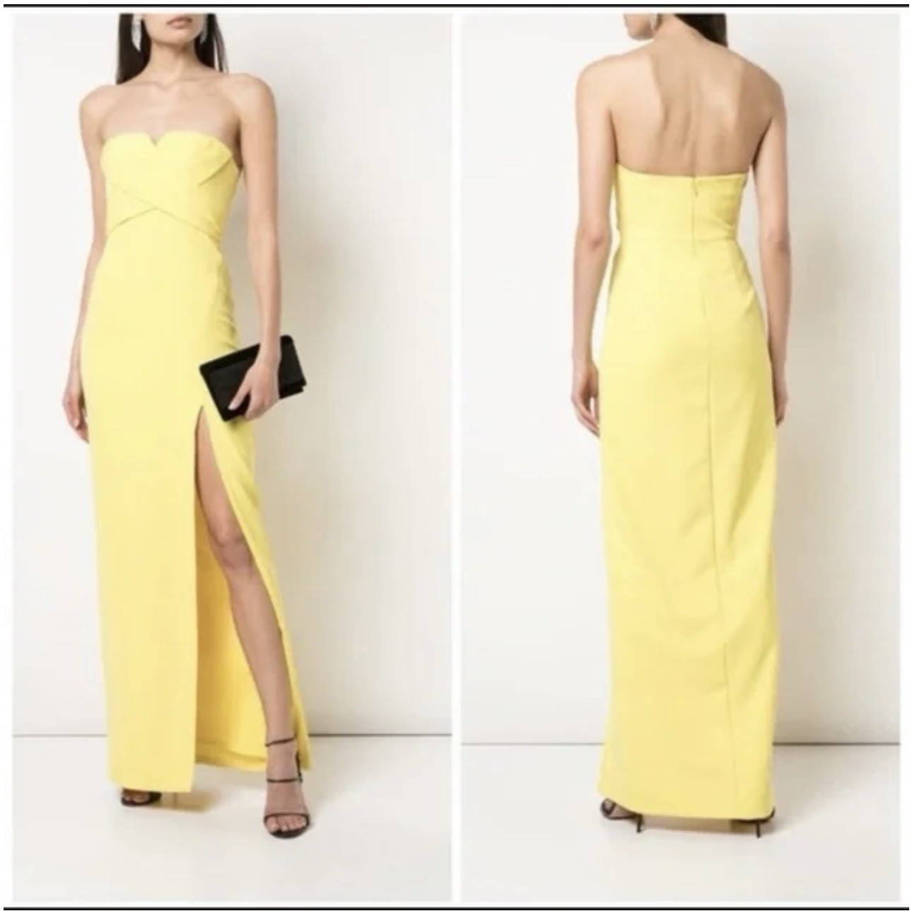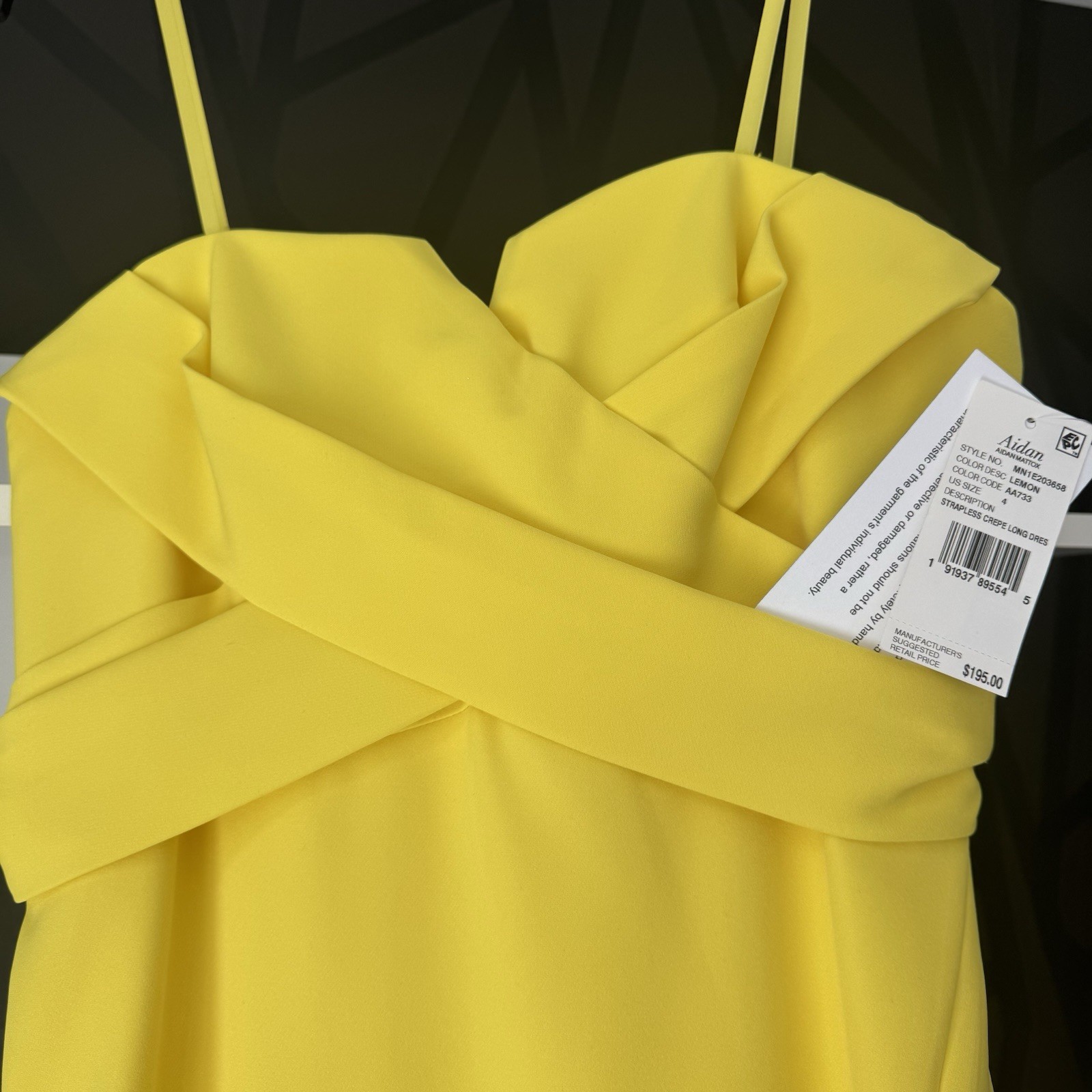 The Aidan by Aidan Mattox Women's Yellow Dress in size 4 is a stylish and vibrant choice for parties and cocktail events. This strapless dress features a solid yellow color with a long length, making it perfect for summer, fall, and spring gatherings. Made from polyester, it has a zip closure for easy wear. The dress also includes elements of a ball gown, A-line, and bodycon style, adding a touch of elegance and flair to your wardrobe. Ideal for those looking to make a statement at special occasions.
