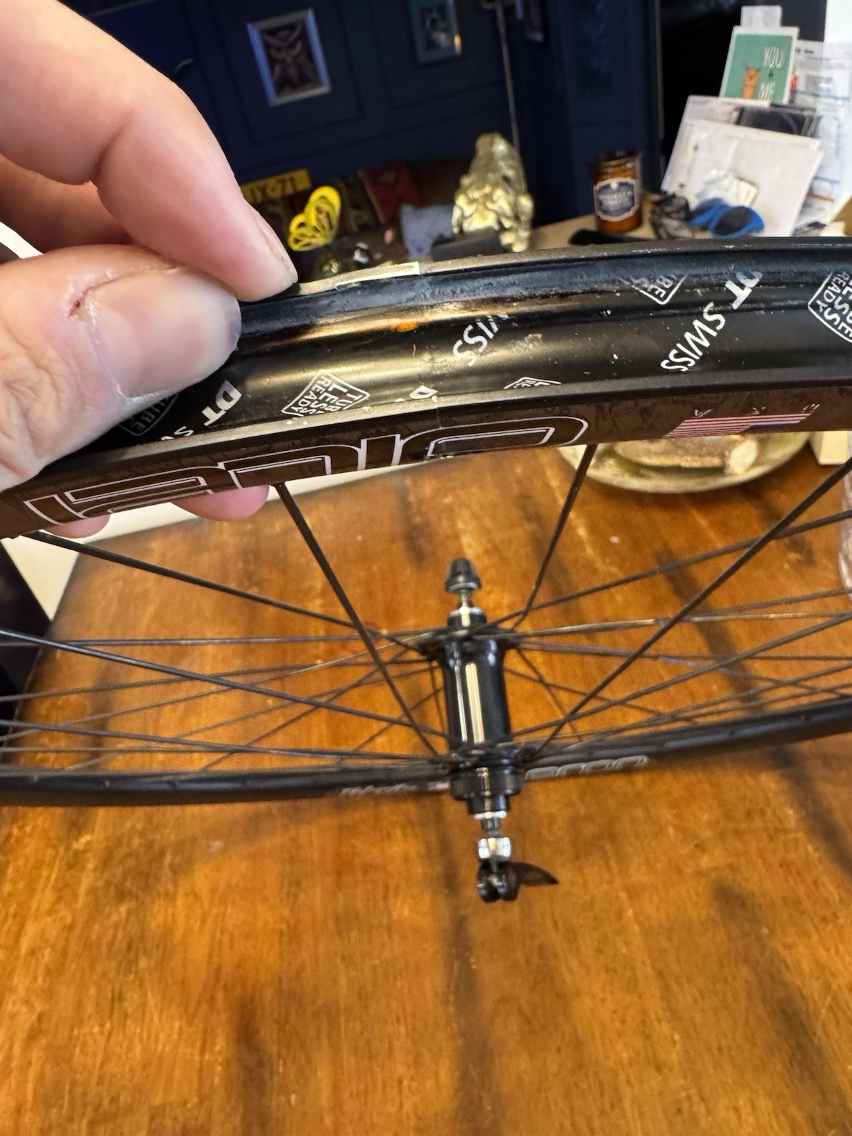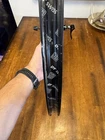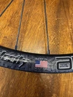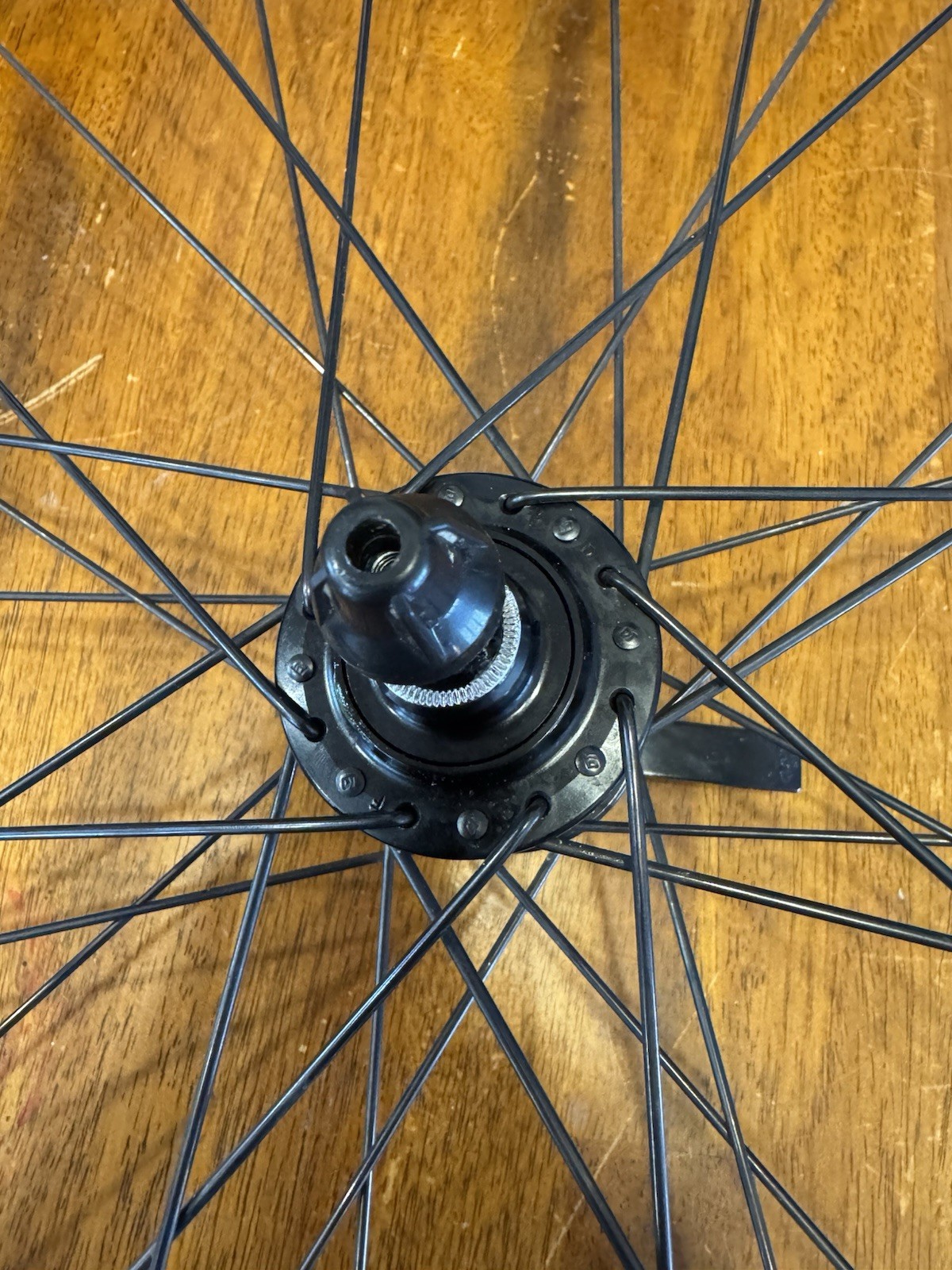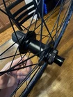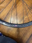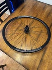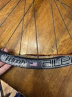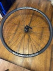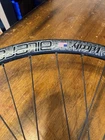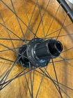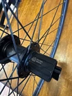 Front wheel is CRACKED! Front wheel is for parts only. Cracked right at the seem. I JB welded it and it does hold air. I do knot advice you to ride on it until lacing a new rim. Hub is like new. It is a 12x100 hub but has QR adapter caps to run on a QR fork could be converted back to TA. Rear wheel is like new. Has a Shimano driver body. Both wheels are tru but front rim must be replaced to make safe.