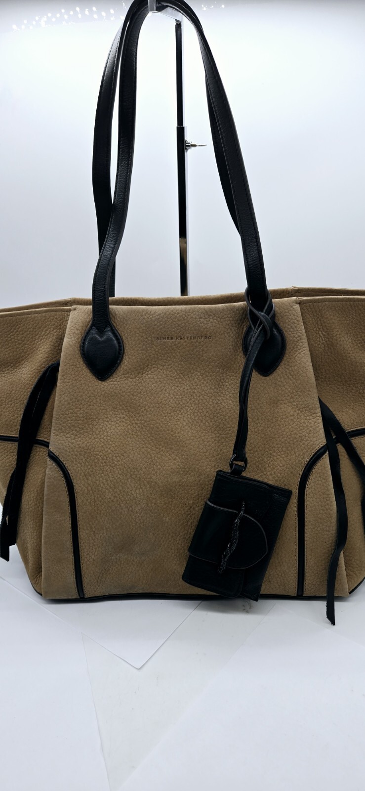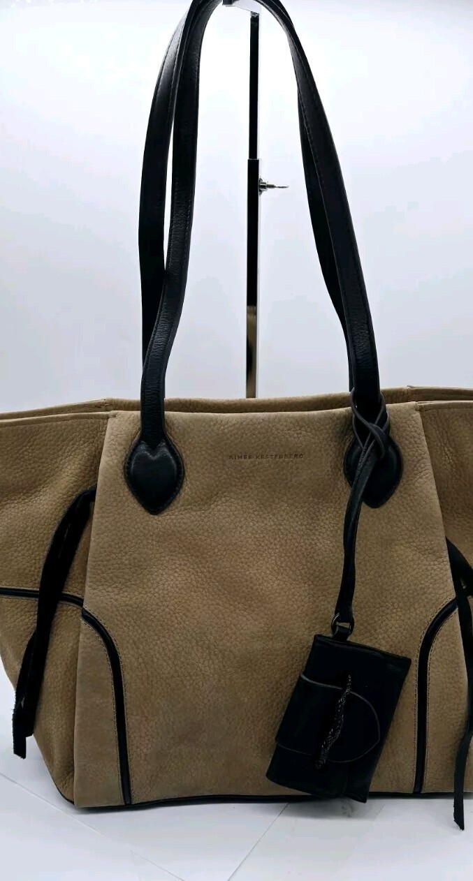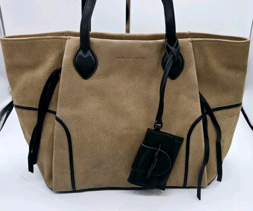 Style: Fierce & Fab Main entry magnetic snap closure, two shoulder straps, two front zip pockets, back magnetic snap pocket, removable coin pouch hang-off, four feet Lined interior, back zip pocket, two slip pockets Measures approximately Top 17" x 11" x 6" with a 10" handle drop; weighs Body 1/trim 100% leather; body 2 100% haircalf leather; lining 100% polyester Imported Brand - Aimee Kestenberg Pre Loved Rating B B+ Very Gently Used oveall Clean very slight soiling to the exterior