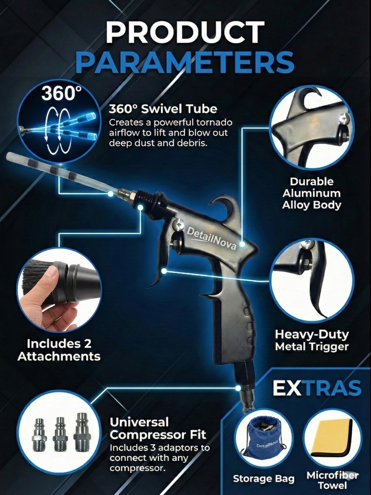 Air Blow Gun for Car Detailing - Durable Tornado Air Gun with Brush Nozzle, Storage Bag, 3 Compressor Adaptors & Microfiber Towel - Requires Compressor, Easy to Set Up Potent Air Power: The Air Gun delivers potent air power, making it a must-have air blaster gun for car enthusiasts and DIY detailers. Easily connect it to an air compressor for car detailing and experience unmatched cleaning efficiency with this air blaster for car detailing. Versatile Compressor Compatibility: Designed to fit every compressor, the Air Gun includes three compressor adaptors. This versatile air compressor gun serves as an indispensable blowout tool for drying and detailing, ensuring seamless compatibility between the air detailing tool and your setup. Comprehensive Accessory Kit: Elevate your car detailing tools and car cleaning supplies with the included brush nozzle attachment, microfiber towel, and durable storage bag. The Air Gun provides all the essential air tools for compressor use, making it a complete auto detailing supplies package for anyone looking for a detailing car kit. Durable Aluminum Alloy Construction: Crafted with a robust aluminum alloy body, this tornado air gun withstands rigorous use, providing long-lasting durability. Ideal for perfectionists, this tornado mini air tool is built to endure the demands of serious car detailing enthusiasts. Effortless Setup and Use: The Air Gun Blower is easy to set up, requiring only an air compressor. As a reliable air blower for car detailing, it simplifies your detailing routine, offering a straightforward solution for efficient and effective vehicle cleaning. The tornado car cleaning gun offers professional-grade power, establishing itself as an essential component of specialized detailing equipment for modern vehicle care. This versatile tool is built to elevate your performance beyond standard auto detailing tools, providing deep cleaning capability in challenging, hard-to-reach areas of the car interior and exterior. Professional-grade Performance Engineered for consistent, heavy-duty use, this advanced car detailing air gun features a durable, heavy-duty aluminum alloy construction. This material choice ensures longevity, making this air blow gun a reliable choice. Whether you refer to it as an air pressure gun or a dedicated high pressure cleaning gun, its robust build guarantees consistent results, making it a great detail air gun for serious enthusiasts and professionals alike. Full Compressor Compatibility and Required Setup Please note: This specialized cleaning device is designed as an air compressor air gun accessory and requires an external air compressor system for operation. It connects effortlessly to standard air systems, functioning ideally as a high-efficiency air blower for compressor applications between 60–150 PSI. The kit includes universal adaptors and is optimized to work as a comprehensive car detailing air compressor attachment. Utilize this system as your primary air compressor detailing tool, featuring an upgraded air compressor blower nozzle designed for maximum air flow. Ultimate Versatility and Deep Cleaning Action The unique vortex technology inside this professional tornado gun for detailing converts compressed air into a powerful, swirling stream, effectively transforming it into a formidable blow out tool for dislodging embedded grime. Maximize your cleaning options with the inclusion of two interchangeable nozzles, allowing this powerful detailing blow gun to adapt to various surfaces. Use the focused air stream as a dedicated dust removing gun for tight console areas, or switch to the wider output to use it as a powerful car detailing blower for carpets and seats. This dual functionality ensures it serves efficiently as a versatile air blower gun for car detailing and a heavy-duty car detail air blower gun. This high-performance system is often sought out as a reliable air compressor gun blower or air compressor blower and is designed to tackle everything from fine particulate removal to deep carpet extraction. The impressive power and vortex efficiency of this tool, also known as the tornado dry cleaning gun, allows it to deliver amazing results for your car detailing equipment needs. For those requiring extreme cleaning, this tool functions as a robust air gun and high-velocity detailing air blower. Its impressive output makes it a favored air tool for car detailing, and its powerful cleaning action provides deep and effective results. The innovative technology ensures great quality and high performance, delivering a strong air flow for superior cleaning. Finally, keep your complete set of detailing tools and accessories securely protected and highly portable with the included storage bag. Whether you use it as a reliable car detail blower or a heavy-duty car detailing blower gun, this convenient addition ensures you always have a ready-to-go air compressor attachments for car detailing kit. The vortex tornado gun delivers reliable results every time, making it a strong choice for achieving a truly clean finish. Shipping We offer FREE shipping on all orders! We ship within Three business days of payment, usually sooner. We use a selection of shipping services such as UPS, FedEx, USPS etc. We only ship to the lower 48 states, no APO/FPO addresses or PO Boxes allowed. Local pickups and combined shipping options are not provided at this time. Return You can return a product for up to 30 days from the date you purchased it. Any product you return must be in the same condition you received it and in the original packaging. Please keep the receipt. Payment We accept payment by any of the following methods: PayPal Please pay as soon as possible after winning an auction, as that will allow us to post your item to you sooner! Feedback Customer satisfaction is very important to us. If you have any problem with your order, please contact us and we will do our best to make you satisfied. Contact Us If you have any quer