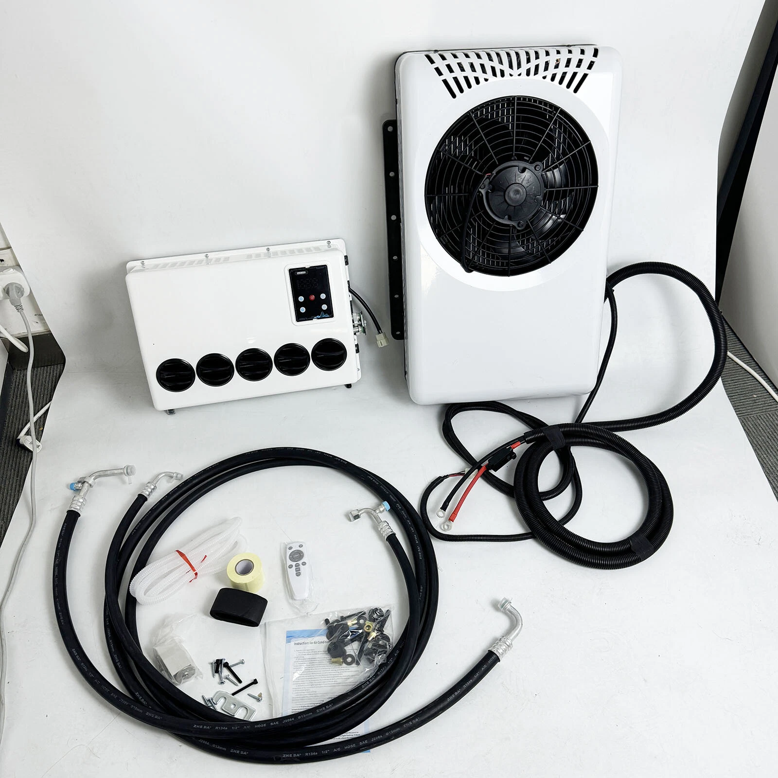 Item spec ification Specification: Voltage: 12V Undervoltage protection: 9-11.2V Rated current: 30-50A Cooling capacity: 800-2400W Airflow: 250-650 m³/h Rated power: 300-850W Coefficient of performance: ≥2.5 Refrigeration oil model: POE68(90ml-120ml) Refrigerant/Charge: R134A/600G(not included) Control mode: Intelligent drive Rotating speed range: 1600-3800r/min Outside machine size : 700*410*180mm(27.56*16.14*7.09in) Size of internal machine : 460*320*160mm(18.11*12.6*6.3in) It is powered by th e battery of the Truck car. WHAT IS PARKI NG A I R CON DITIONER ? The parking air conditioner is a kind of in-car air conditioner. It refers to the equipment that uses the on-board battery DC power supply (12V) to make the air conditioner run continuously when parking and waiting and resting, and to adjust and control the temperature, humidity, flow rate and other parameters of the ambient air in the car, so as to fully meet the comfort cooling needs of the truck driver. Normally drivers leaving the engine running for hours to use the air conditioner during parking or rest time at night, it is bad for the environment and tons of fuel wasted, it also wears down the engine faster. Parking air conditioner works with truck battery power without engine on which can save energy and fuel and at same time provide safe and comfortable environment for driver. Fuel,Energy And Money Saving. Digital frequency conversion control, more efficient and more energy saving. Use energy saving mode when you sleep at night, it can run continuously 6 to 8 hours. Use super mode in hottest hours, cooling rapidly and stronger air supply. Installation 1.Remove the outer casing. 2.Select the installation position and mark the punch position. (Select 5 installation points) 3.Punch holes at the mark points. (Tool: an 8mm/0.3inch drill) 4.Use a pull riveter to fix the pull rivet nut at the marked hole. 5.Fixed the damping pad and sleeve at the marked points on the external 6.machine. 7.Fixed the external machine. 8.Install the internal machine: install an expansion valve. 9.Fixed internal machine mounting plate. 10.Fixed the internal machine. 11.3/8inch pipe (high-pressure pipe) connected to the condenser. 12.Connect internal and external machine wires and power cord. 13.Connect internal and external pipes, and fixed the evaporation box. 14.Connect internal and external wires. 15.Install the drainage pipe. 16.Vacuum for 15-20 minutes. 17.Refill refrigerant (Pure R134a) 400-450g/0.88-0.99lbs. 18.The power cord is connected to the battery. 19.Install the outer casing. 20.Winding tape to fix the internal and external machine connecting pipe and the internal and external machine connecting wire. 21.The installation is complete. Package Included 1* Air Conditioner Kit (2 packages) 1* Remote Control Other Accessories for Assembly Payment Delivery details Terms of sales About us Contact us Payment We accept PayPal,ebay payment. Please make sure your address is correct before you pay. Feedback will be left automatically after we receive your feedback. Please contact us before leaving a Negative feedback or Neutral feedback. We would try our best to help you solving any problem. Delivery details We Ship Worldwide. Item will be shipped out within 1-3 business day after full payment received. Delivery Time: USA ------------------------------- 7-15 Working Days by China Epacket delivery. Australia ------------------------ 7-12 Working Days by AUpost-eparcel from China. UK/ Canada -------------------- 10-20 Working Days Europe -------------------------- 10-25 Working Days Italy/ South America ------ 12-25 Working Days Terms of sales We offers 30-day refund, and 1 year manufactured warranty on all products, Warranty period starts from the date of purchase. After 30 days from the date of purchase, all return can only be replaced by same item, unless this item is out of stock at that moment,buyer need pay the shipping fee. * Warranty will be voided if the product is mishandled or physical damaged by customer. We will refuse back all the returns which are out of warranty. * We are not responsible for any kind of compatible issues, or problems related to any specific software or games. Return Policy Returns are permitted and must be initiated by the buyer within 30 days from the date of purchase. About us Contact us - Our Support Team is Here For You! Our goal is to earn 5 Star Positive Feedback on every sale! 1 or 2 Star DSR Ratings Destroy Our Company. We would appreciate the chance to correct any problems before posting anything other than positive feedback. We encourage our customers to contact in order to resolve any issues regarding the transaction before leave negative feedback on eBay. Please make sure to contact us before you leave feedback. Contact us Our Duty Time China Time USA(pacific time) Start End Start End Monday AM 9:00 PM 18:00 Sunday PM 17:00 Monday AM 2:00 Tuesday AM 9:00 PM 18:00 Monday PM 17:00 Tuesday AM 2:00 Wednesday AM 9:00 PM 18:00 Tuesday PM 17:00 Wednesday AM 2:00 Thursday AM 9:00 PM 18:00 Wednesday PM 17:00 Thursday AM 2:00 Friday AM 9:00 PM 18:00 Thursday PM 17:00 Friday AM 2:00 Saturday Out of Duty Friday Saturday Sunday Out of Duty Saturday Sunday Please leave us positive feedback upon satisfactory receipt of the item. We have a program that automatically replies as soon as you leave your feedback. We care about our valued customers, and will always try to help you. So if you have any problems, please e-mail us immediately. Please give us the opportunity to resolve a problem. We understand the concerns and frustrations you might have, and will try our best to resolve the issues. Please email us before leaving negative feedback . All communications are handled through Email. We strive to answer all emails as quickly as possible, but due to high email volume it may take time for us to reply. Thanks in advance for your patience. Due to some ISP SPAM filter settings, you may not be able to receive our email repli