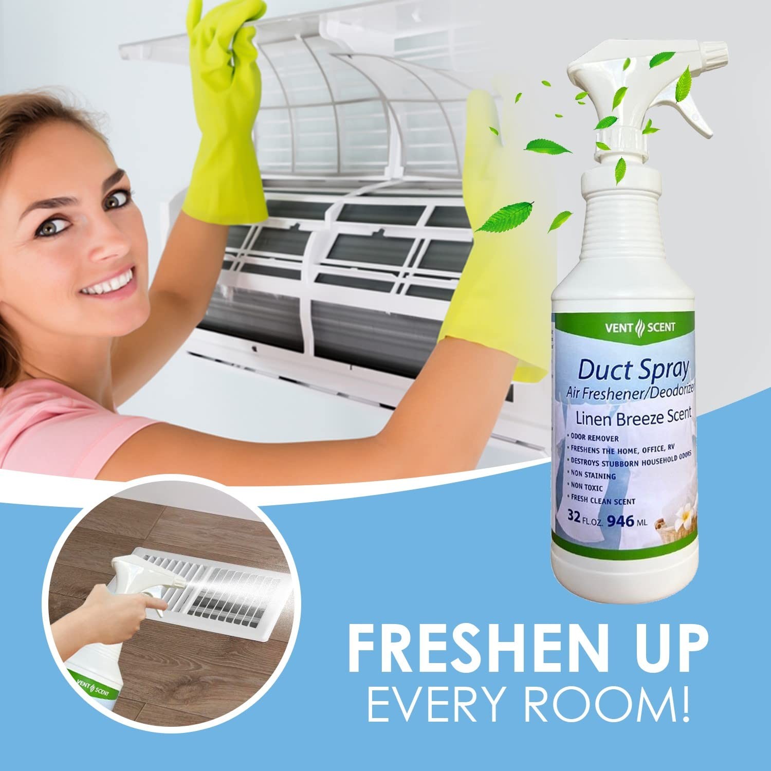 Keep your Home air smelling fresh with the Air Duct Cleaner, Whole House Air Freshener & Air Duct Deodorizer. Our scientifically engineered odor removal solution is a "whole house" odor removal by not simply masking odors but removing them. This furnace air freshener / ac air freshener is safe and easy to use. Test a small at first to determine how much spray is right for the conditions in the desired area of use. Then, spray that determined amount into HVAC ducts, air filter media, air vent filters, floor vents filters, musty closets, basements, RV's or boats for safe and effective odor removal. This professional strength formula is highly effective, versatile, and non-staining. Breathe easy knowing your odors are being removed. The spray formula also allows you to target stubborn odor prone areas - lockers, storage areas, laundry rooms or any spaces that need refreshing. Commonly used in homes, offices, nursing homes, and anywhere pesky odors linger. PEACE AND RELAXATION - Get the peace and relaxation back in your house, office, and car with our Fresh Linen Breeze scented AC Air Freshener / Furnace Air Freshener and Air Vent Freshener for Home and Business . Designed as a WHOLE HOUSE air freshener and ENTIRE OFFICE odor removal solution. This spray does not mask odors , but removes the bad odors from your floor vents and HVAC vents and replaces it with the smell of fresh linen breeze. PROFESSIONAL STREGNTH: This professional strength formula is highly effective, versatile, non-staining, but no over powering. Specially made as an ac vent cleaner, air vent deodorizer ,air freshener for furnace filter, furnace deodorizer, and HVAC odor eliminator. Its the ultimate vent air freshener for home and auto. Perfect for industrial, commercial, business, automotive and residential applications. EASY TO USE - Breathe easy knowing your odors are being removed. Rest easy knowing this HVAC odor spray for home and air conditioner cleaner spray is easy to use in automobiles and as a whole home air freshener and car vent cleaner spray . AIR DUCT CLEANING SPRAY - Remove duct smells by using as an HVAC sanitizer spray and air duct cleaning spray. Spray directly on your floor air vent filters for home or directly in to your air ducts and returns. This air filter freshener is the perfect air filter freshener for home ac unit, as an air conditioner air freshener, and is one of the best all around air vent fresheners for home and business. Directions: To use as a home air deodorizer, spray LIBERALLY into duct system floor vents. This can also be sprayed on air vent filters as an air conditioner freshener. Also, apply generously as a central air freshener. Simply spray the home deodorizer spray to affected areas. This whole house air freshener for HVAC systems can be used in any room, office, locker room, office, RV, or BOAT to eliminate odors.