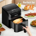 Air Fryer 4.5 Qt, Small Airfryer Digital Space Saving Compact, Bake, Reheat, Roasts for Quick Easy Meals, Mini Compact & Quiet, Nonstick & Dishwasher Safe Basket with Toast Rack (Black) FAST & EASY: Little to no preheating time, from frozen to golden in minutes! The 4.5 quart air fryer touchscreen display can customize your cooking time and temperature up to a maximum of 400°F! HEALTHY FRY: This mini air fryer uses little oil to make delicious meals that are good for you. Airflow top down for a perfect golden finish and crispy, tender results every time! Enjoy crispy textures with up to 90% less oil than traditional frying. SPACE-SAVER: The square basket maximizes its 4.5quart capacity. Housed in a sleek, narrow design to keep its countertop footprint small, this air fryer eliminates clutter and extraneous appliances. Separate display and 8 preset functions, you can cook your favorite food with one click. COMPACT SHAPE: This air fryer is perfectly sized for healthy meals for 2-4 people. It fits in perfectly as a mainstay on your countertop, or its small frame fits perfectly in your cabinets. You can now cook your favorite foods without the distraction of annoying or disruptive noise. QUICK CLEAN: The BPA-Free nonstick 4.5-quart basket and accessories are both dishwasher safe to keep clean-up fast and simple.