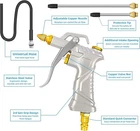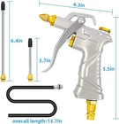 [Flexible Universal Air Blow Hose] -- Easily clean hard-to-reach narrow gaps, inside pipes and machine parts. [Short Nozzle] -- Adjustable copper nozzle rotates to control air flow volume, suitable for general scenes. [Straight Gun Nozzle] -- 3.7 and 6.4 inches, used in the more difficult to enter the space, strongly concentrated air nozzle. [Strong Airflow] -- Quality air compressor tools with high volume air flow, ideal for carpentry workplace and industrial workshop dust or powders blow off. Also for car repair shop cleaning work, household blind corner blowing off. [Air Tools and Accessories] -- You will get: 1 x air blow gun with standard quick coupling, 1 x adjustable air flow short nozzle, 2 x steel air flow extension, 1 x universal blow hose, 6 x sealing ring.