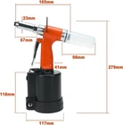 Product Description Features Easy to Operate, Light Weight, No Fatigue for Long Time Use; A powerful and reliable high-speed production tool; Performs well at any angles; Noise elimination design, low noise during operation; Low weight, comfortable grip, ergonomic design, and easy operation; Nosepieces conveniently store underneath rubber base; Includes (4) Nose Pieces 1/8", 5/32", 3/16", and 1/4"; Quick-release air valve for fast cylinder return; The vacuum switch is used to effectively utilize compressed air; Comes with replaceable three-piece steel teeth and 2 different kinds of the wrench. Package Includes: 1 x Air rivet gun; 4 x Nose piece ( 1/8", 5/32", 3/16", and 1/4", one of them is on the rivet gun); 3 x Nozzle assistance tool; 2 x Wrench; 1 x Connector; 1 x Rivet collecting bottle; 1 x Manual; High Quality The Pop Pneumatic Riveting Gun is designed for rivets in aluminum, copper, and other softer materials. Different Size 1/4-inch (6.4mm), 3/16-inch (4.8mm), 5/32-inch (4mm), 1/8-inch (3.2mm) (1 piece is installed onto the gun head, 3 pieces are in the package). Specification Maximum stroke:16mm (0.63 in); nail diameter: 4 mm - 6.4mm (0.16 - 0.25 in); 1/4" AIR INLET PORT INSIDE THREAD STD - 1/4" (6.35mm) You may also like 86Pc Threaded Nut Rivet M3-M8 Insert Set Riveter Rivnut Nutsert Gun Riveting Kit 26.55 USD 28.25 USD Free shipping 6% off