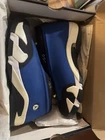 This is a pair of Air Jordan 14 sneakers in the "Laney" colorway, featuring a low top design with a suede upper in Varsity Royal, Black, Varsity Maize, and White. They are a size 12 and were released in 2015 as part of the Air Jordan product line. The style code is 807511-405, and they are an athletic shoe designed for men.