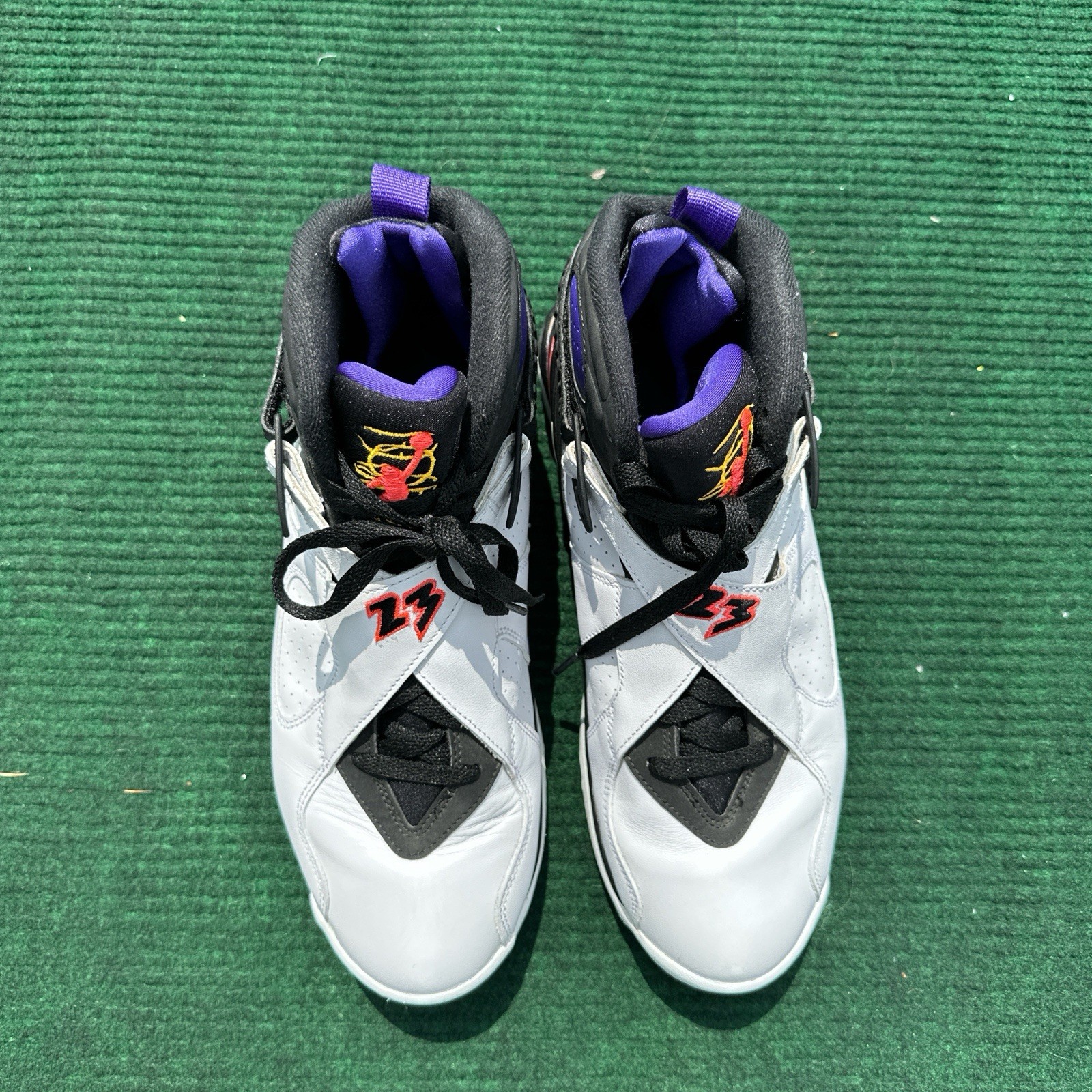 Air Jordan 8 'Three-Peat' Men’s Size 9.5 WHITE SOLES HAVE BEEN REPAINTED. NOT SURE WHY. SHOES ARE IN EXCELLENT CONDITION white sneakers, retro basketball, sporty kicks, vibrant accents, chunky sole, classic style, pre-owned shoes, athletic footwear, multicolor details