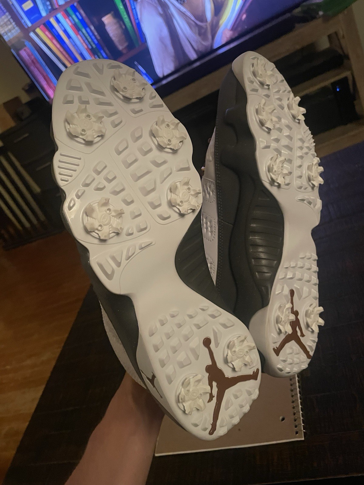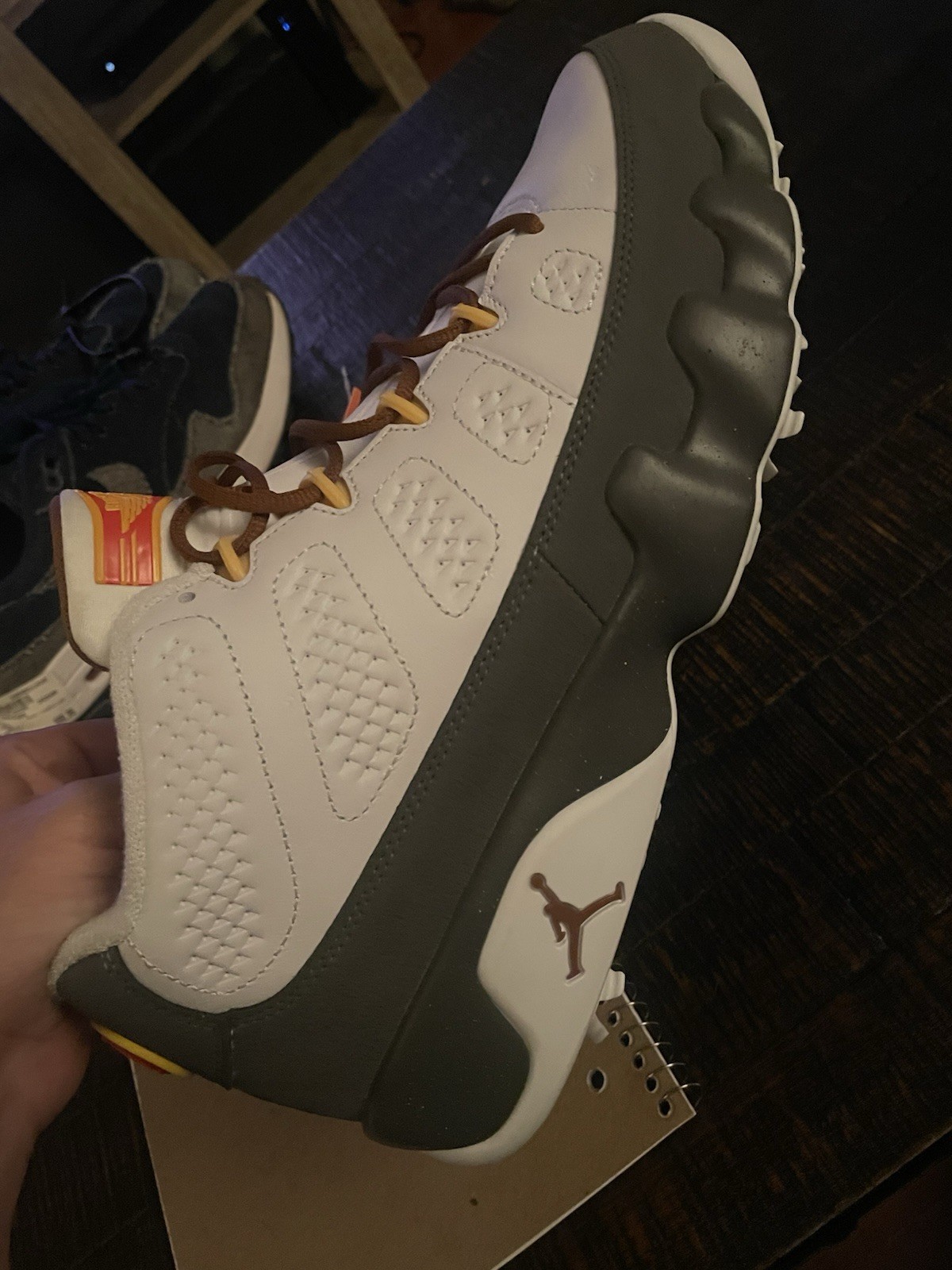 The product is a pair of size 12.5 Air Jordan 9 Golf Low sneakers designed for the US Open, featuring a low top style and a color scheme of white, university gold, cool grey, and anthracite. Made with leather material, these athletic shoes are part of the Air Jordan product line and have a stylish sneaker design. With a release year of 2024, this specific model is the FN6931-100, making it a highly collectible and sought-after item for golf enthusiasts and Jordan fans alike. Perfect for the US Open or any golf event, these sneakers combine style and functionality for a fashionable and comfortable look on the course.