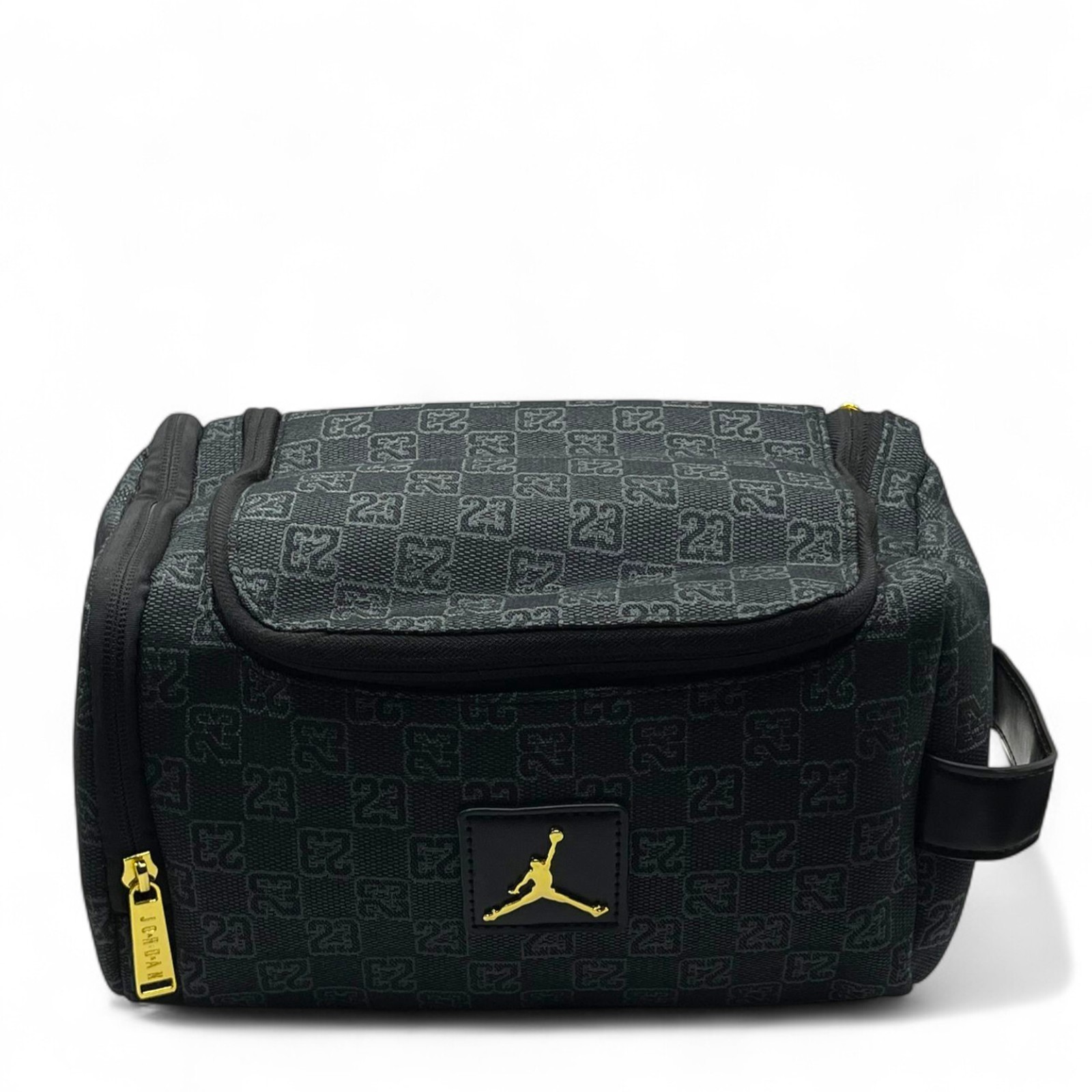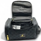 Brand new with tags Nike Jordan Jumpman monogram toiletry bag dopp kit in rare, limited edition color black with gold hardware. Organize your essentials in a single, handy location using the dopp kit provided. Crafted from durable poly fabric and adorned with a sophisticated woven design, this kit features a secure top zipper and a convenient side handle. Internally, you'll find a front mesh pocket with hook-and-loop closure and a rear mesh pocket, ensuring efficient organization of your belongings. The lining is made of PVC to protect the outside of the bag from any spills.