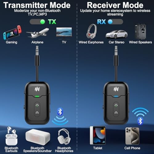2-in-1 Transmitter Receiver: This device supports both transmitting (TX) and receiving (RX) modes, making it an excellent Bluetooth transmitter for TV and other non-Bluetooth audio sources. In TX mode, it streams audio from TVs, computers, or airplane entertainment systems to Bluetooth headphones. In RX mode, it functions as a Bluetooth car adapter, allowing smartphones to wirelessly connect to wired speakers or stereos. Wide Compatibility: The included dual 3.5mm adapter ensures the B103 is a top choice for a Bluetooth adapter for airplane use, compatible with any aircraft audio output jack. It also connects seamlessly with AUX-compatible devices like tablets, PCs, and gym equipment, making it a versatile Bluetooth headphone adapter for various applications. Advanced Bluetooth Technology: Featuring Bluetooth 5.4 and a Qualcomm Chip, this product is designed for stable, reliable connections, serving as a great Bluetooth audio transmitter. It supports aptX-Adaptive and aptX-Low Latency codecs, providing high-quality audio with minimal delay, ideal for in-flight entertainment systems and other settings. Safety and Long Battery Life: Compliant with global safety standards, including FCC, CE, RoHS, and BQB certifications, this Bluetooth transmitter for airplane offers over 24 hours of battery life on a single charge. It also has safety features such as voltage endurance, overcurrent protection, and short-circuit protection, charging fully in just 2 hours via the included Type-C cable.