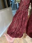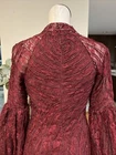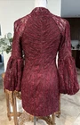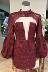 Look stunning in this gorgeous burgundy Ammo dress featuring a mock neck and a zip closure. Perfect for weddings, parties, cocktails, and other special occasions, this dress is made of high-quality lace fabric with pleated and layered accents, creating a slimming effect. The short dress has long puff sleeves with a banded design, adding a touch of elegance to the overall attire. This dress is from the Celiste collection and is a mini sheath style with a cut-out design, making it perfect for clubwear, prom, homecoming, and other events. The dress is collarless and has a corset and overlay design, providing a classic and preppy look. The dress is available in a medium size and is made of a polyester-spandex blend that is midweight and lined. In excellent condition like new Bust 16.5” Length 32.5” N3DTH57