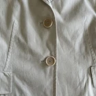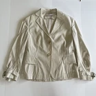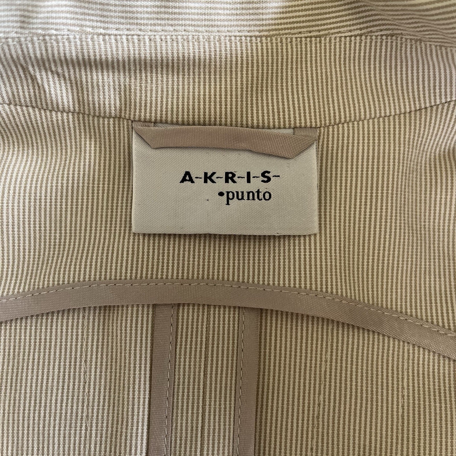 Akris Punto beige white pin stripe Tailored Blazer Jacket Cotton Size 4 Womens Size 4/ FR 36 64% Cotton, 34% Viscose, and 2% elastic 2 button jacket Pockets 18'' pit to pit 22'' L 20'' Sleeve length The perfect lightweight jacket for any season. The tailored details on the back are beautifully construction and very flatting. The belted cuff sleeves are also a gorgeous touch. Great condition overall no signs of wear.