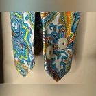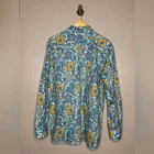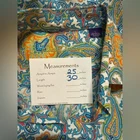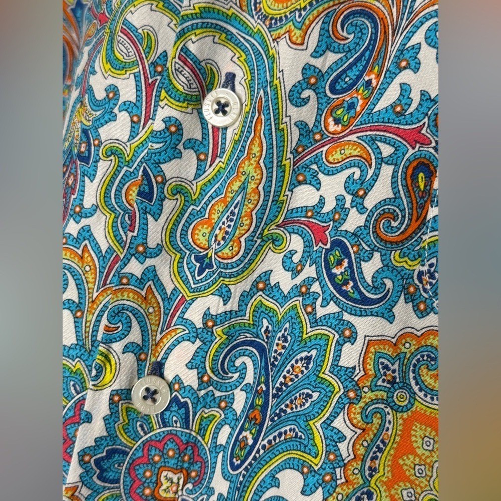 Bold and vibrant Alan Flusser long-sleeve button-down shirt featuring an intricate blue, teal, orange, and yellow paisley print. Made from soft 100% cotton with a crisp structure and a standout design. Great for elevated casual wear, vacations, nights out, or adding a statement piece to any wardrobe. Details Brand: Alan Flusser Size: Large Fabric: 100% Cotton Color/Pattern: Multicolor paisley Style: Long-sleeve button-down, classic collar, button cuffs Condition Great pre-owned condition with no major flaws. Measurements (approx.) Pit to Pit: 25 in Length: 30 in Paisley shirt, men's button down, bold print shirt, retro menswear, vintage-inspired shirt, colorful casual shirt, resort wear, boho menswear, statement top Model image was created with AI.