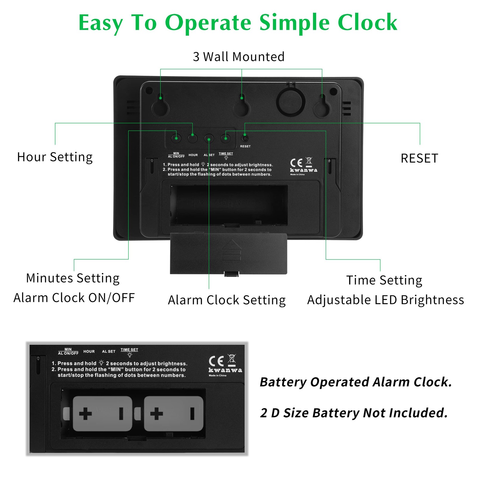 Easy to Read - 3 inch huge LED Time Display against a nice large looking black backlit screen, even the elderly and the dementia patients can easily recognize the time. 24 hours Constantly lit up the LED Digital, without any operation, easy to read day and night. No Messy Cords - The LED digital alarm clock is battery operated (NOT electric plug-in with battery back-up), no messy cords, can be used anywhere you want. Alkaline D Cell Batteries ONLY. 2 PCS totally fresh batteries will support the alarm clock going to work for more than 12 months. Table-top/Wall-mounted -The clock with two unfold stand legs on the back, you can use it as a desk clock, table clock, bedside clock and nightstand clock. The clock has 3 wall-mounting hang holes, you also use it as a small wall clock. A modern decoration LED digital clock, clock for bedroom, clock for kitchen,clock for living room or clock for bathroom. Adjustable Brightness & Auto Night Mode - The digital alarm clock provides 3-level brightness, adjust by manual or auto to a comfortable brightness. The LED light will automatically dim during 8pm~6am your sleep time to protect your eyes at night and save energy. No blinding lights or any annoying sounds disturb your sleep, create an peaceful environment for sleep. High Accuracy & Daily Alarm - We understand that you are always need a clock with accurate time display and works well even after several years. Accuracy of the clock is less than ±30 seconds per month. The alarms' volume will be gradually increased and up to 2 minute. You will not miss your important affairs.